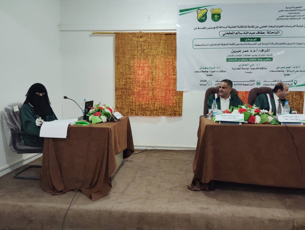 (استراتيجيات التسويق بالمحتوى للشركات اليمنية عبر الفيسبوك وأثرها على الكلمة المنطوقة للمتفاعلين)، وذلك يوم الثلاثاء الموافق 7/12/1446هـ، الموافق 3/6/2024م.