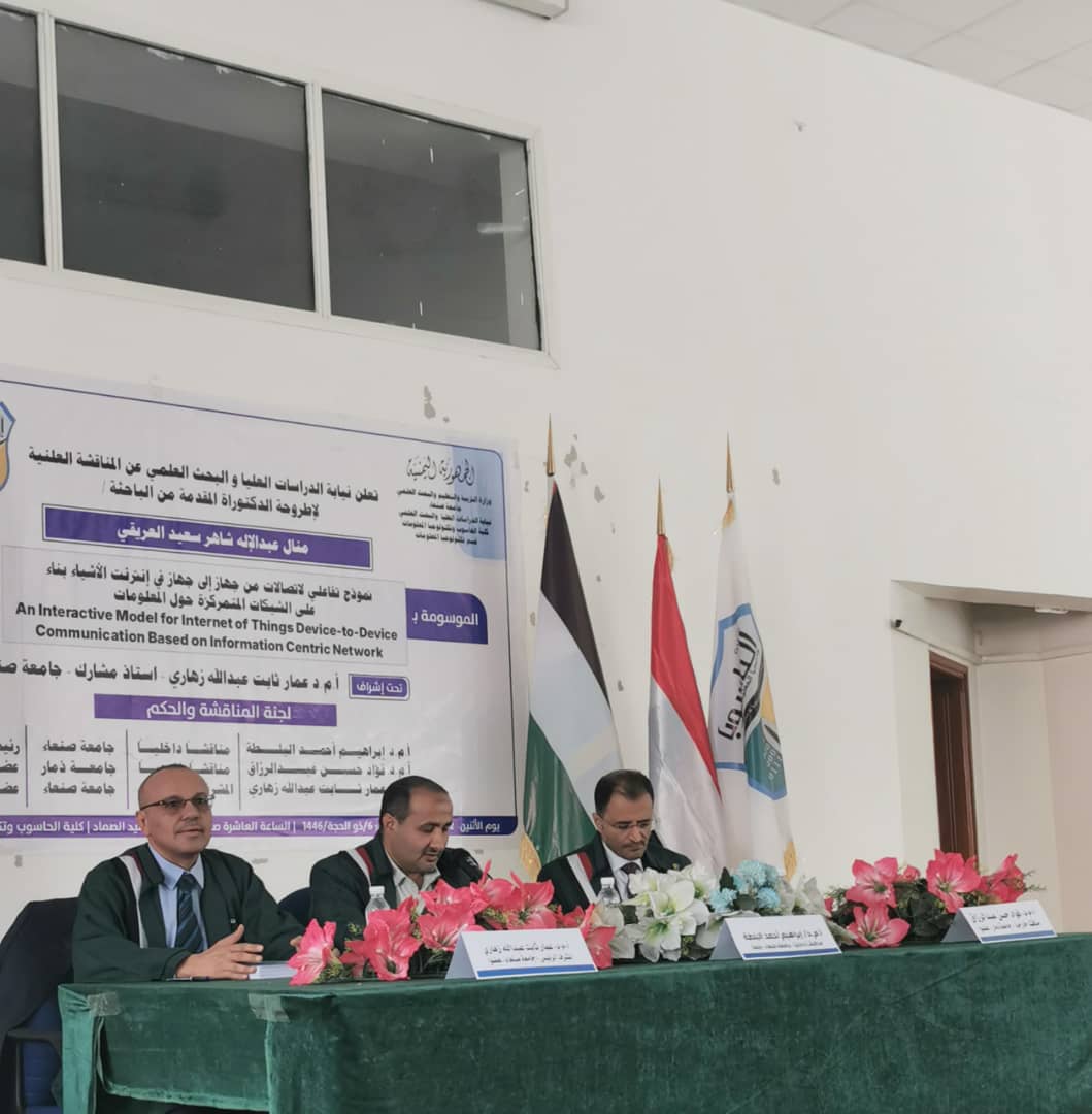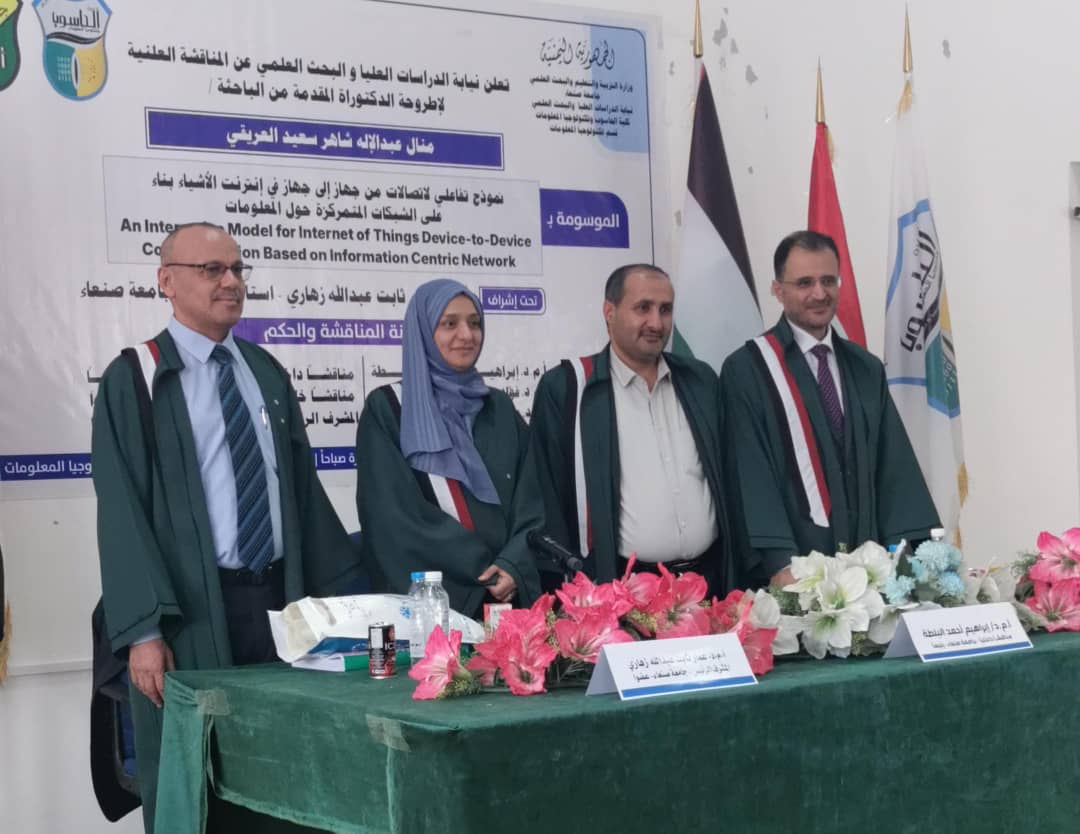نالت الباحثة/ منال عبدالإله شاهر سعيد العريقي درجة الدكتوراه في الفلسفة في الحوسبة وعلم المعلومات – قسم تكنولوجيا المعلومات، تخصص تكنولوجيا المعلومات، من كلية الحاسوب وتكنولوجيا المعلومات – جامعة صنعاء، عن أطروحتها الموسومة بـ “نموذج تفاعلي لاتصالات من جهازٍ إلى جهازٍ في إنترنت الأشياء بناءً على الشبكات المتمركزة حول المعلومات”