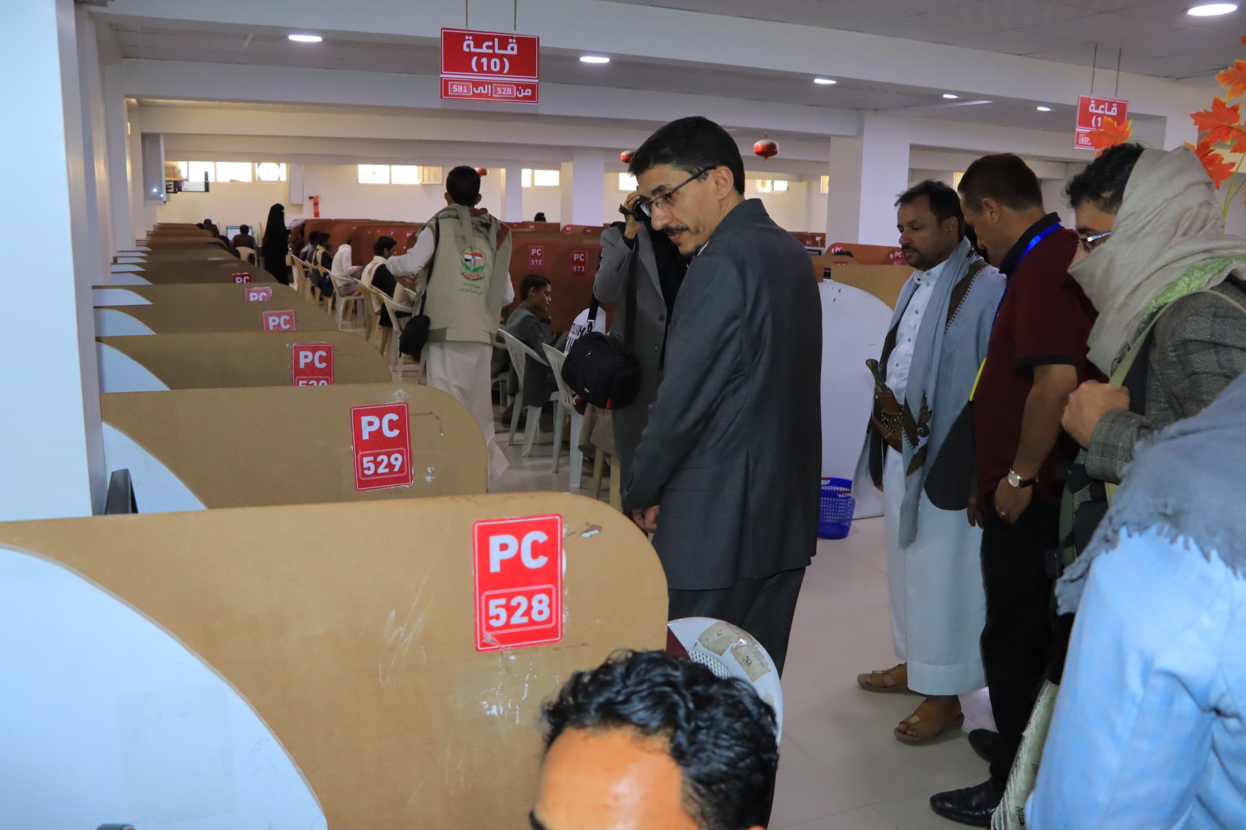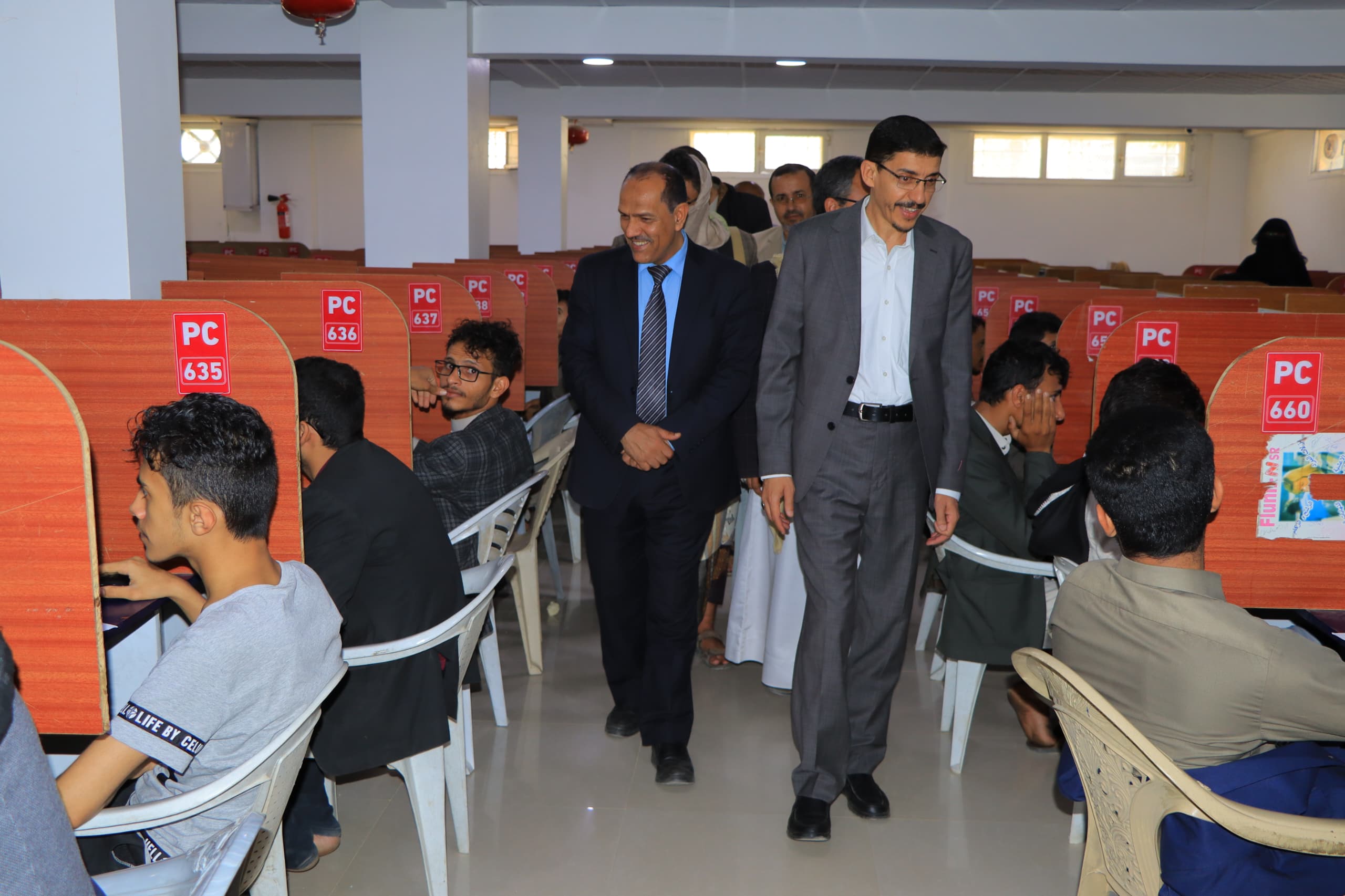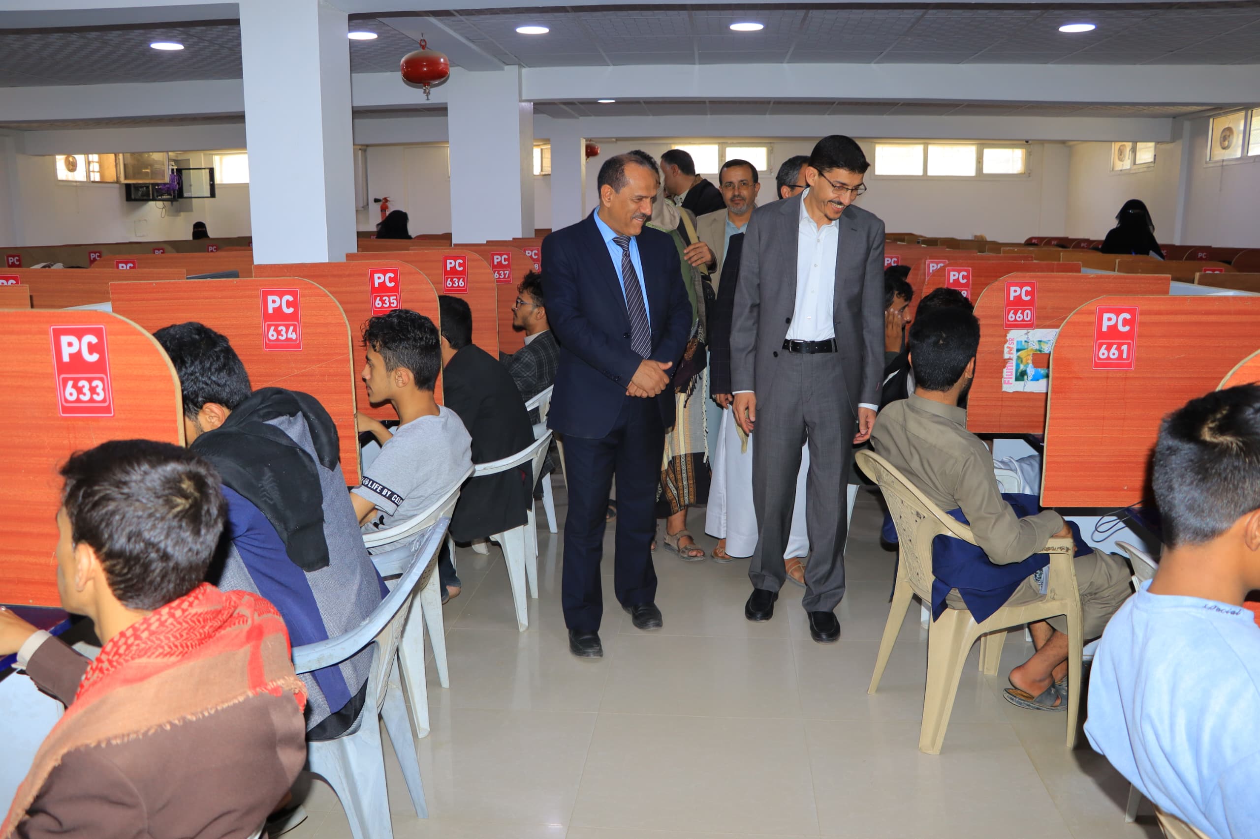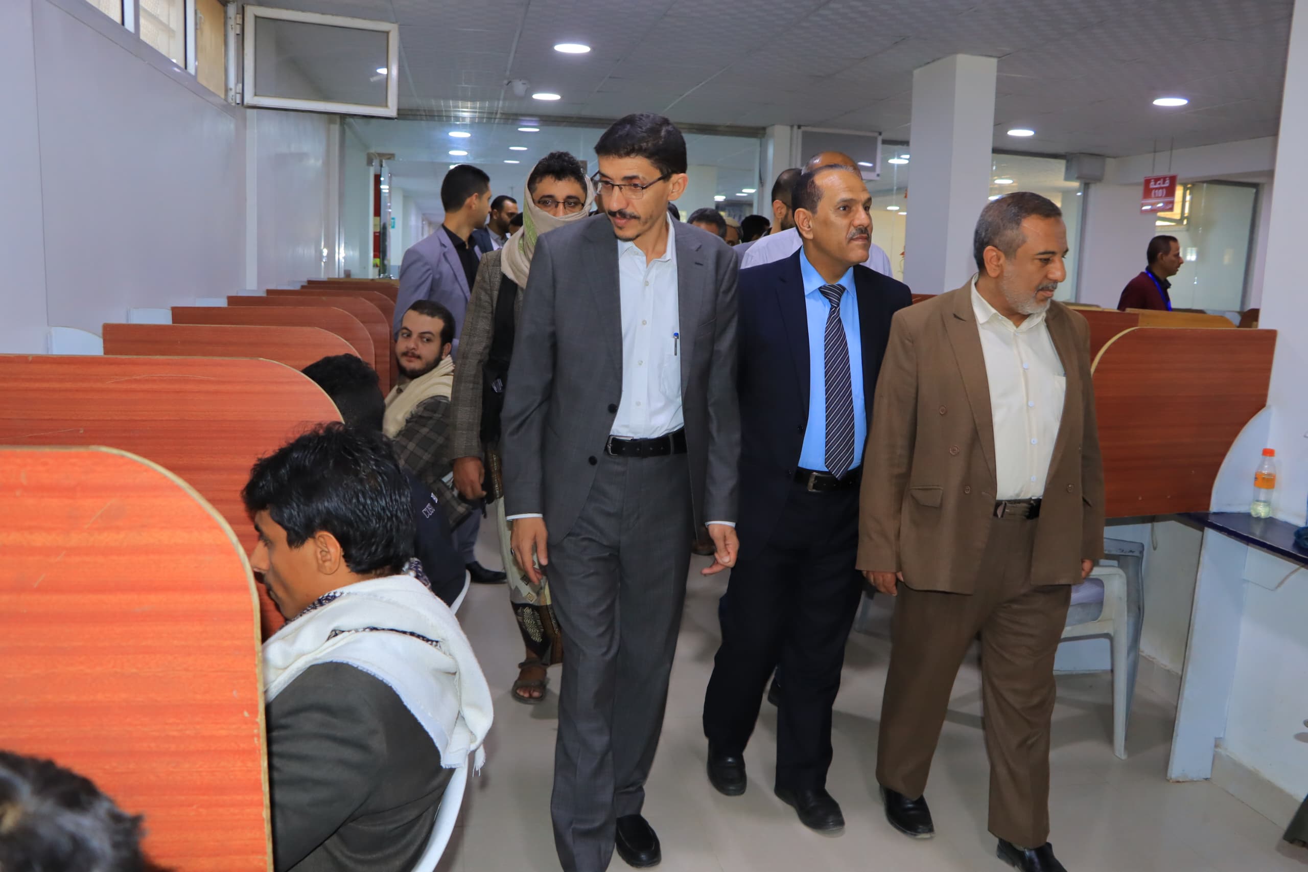 وتعرف الوزير ومعه، وكيل قطاع التعليم العالي – عضو اللجنة الإشرافية الدكتور إبراهيم لقمان، ورئيس جامعة صنعاء الدكتور محمد البخيتي وعضو اللجنة الإشرافية حسن عز الدين، على سير امتحانات الكفاءة للطلاب المتنافسين على المقاعد المجانية في التخصصات الهندسية والحاسوبية والإدارية والإنسانية التي تقدم لها ثلاثة الاف و138 طالباً وطالبة منهم 608 طالبة.