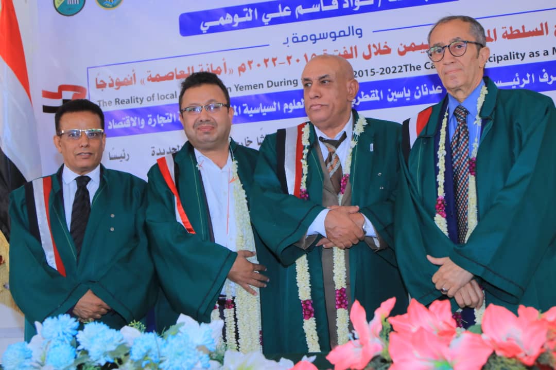 وتكونت لجنة المناقشة والحكم من: أ. م. د/ حميد عبدالغني المخلافي مناقشا خارجيا رئيسا_ جامعة الحديدة، و أ. م. د/ عدنان ياسين المقطري مشرفا عضوا_ جامعة صنعاء و د/ عبدالكريم عبدالله الروضي مناقشا داخليا_جامعة صنعاء.