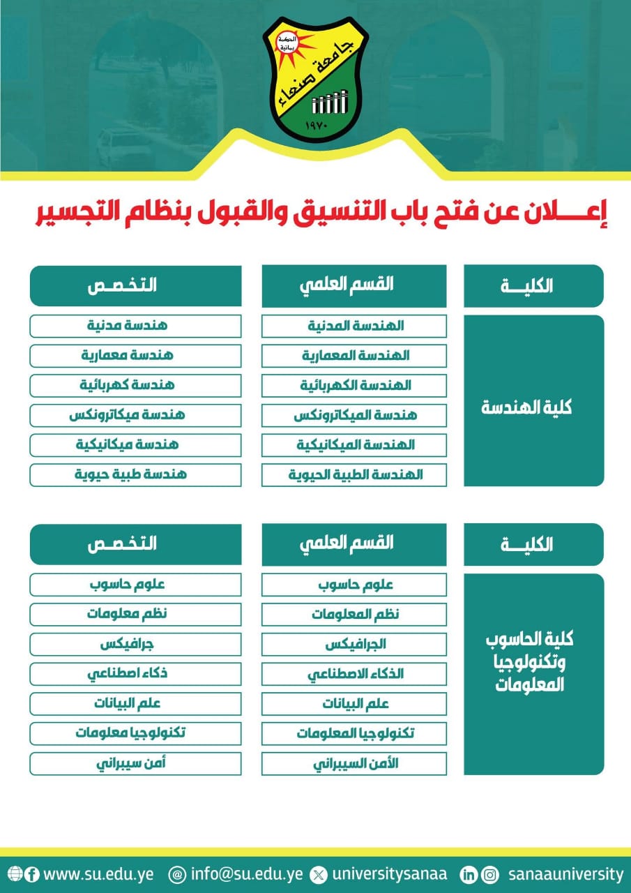 تُعلن نيابة شؤون الطلاب بجامعة صنعاء عن فتح باب التنسيق والقبول (بنظام التجسير) للطلبة الحاصلين على شهادات الدبلوم المتوسط أو التقني (نظام سنتين أو نظام ثلاث سنوات) للعام الجامعي 1447هـ الموافق 2025-2026م، وذلك وفقا لضوابط وشروط نظام التجسير الصادر بالقرار الوزاري رقم (12) لسنة 1447هـ ـ 2025م.