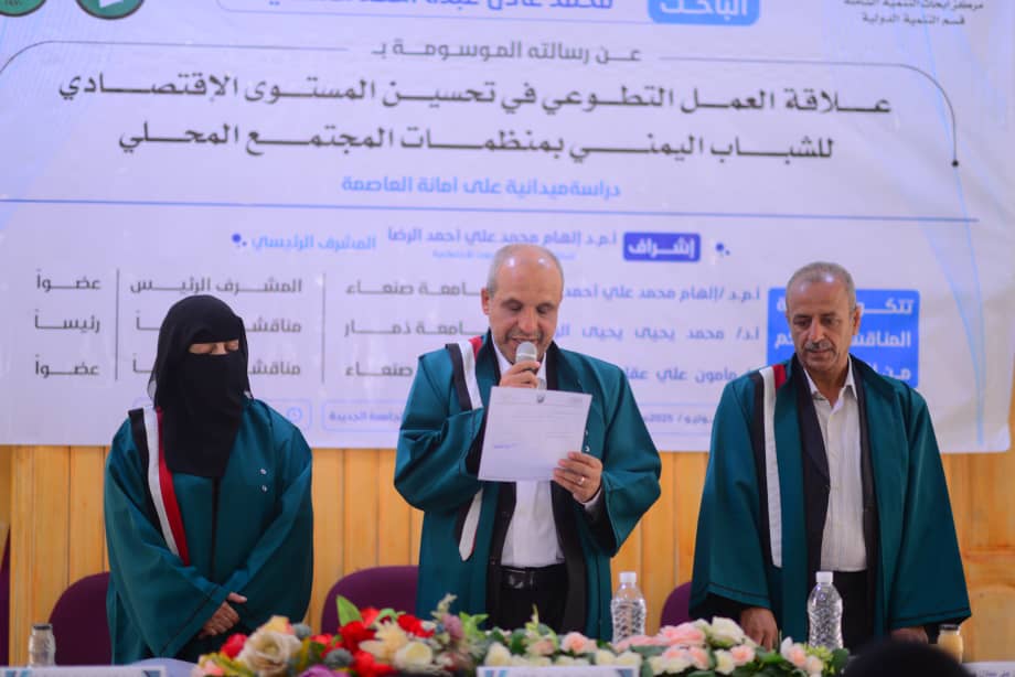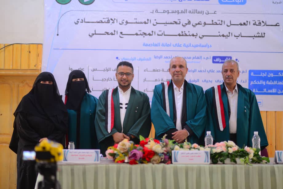 نال الباحث محمد عادل عبده الخدشي درجة الماجستير بتقدير ممتاز تخصص دراسات في التنمية الدولية من مركز أبحاث التنمية الشاملة بجامعة صنعاء، عن رسالته الموسومة بـ “علاقة العمل التطوعي في تحسين المستوى الاقتصادي للشباب اليمني بمنظمات المجتمع المحلي” وذلك يوم السبت الموافق 19 يوليو 2025م.