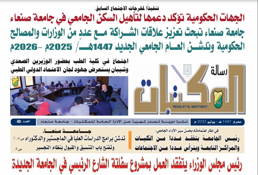 أصدرت الإدارة العامة للمكتبات بجامعة صنعاء العدد (45) من صحيفة رسالة المكتبات، وهي نشرة شهرية متخصصة تُعنى بمتابعة اخبار الجامة والاهتمام بمجال المكتبات وعلم المعلومات، وذلك ضمن جهودها المستمرة في التوعية والتثقيف بمجالات المعرفة والمعلومات.