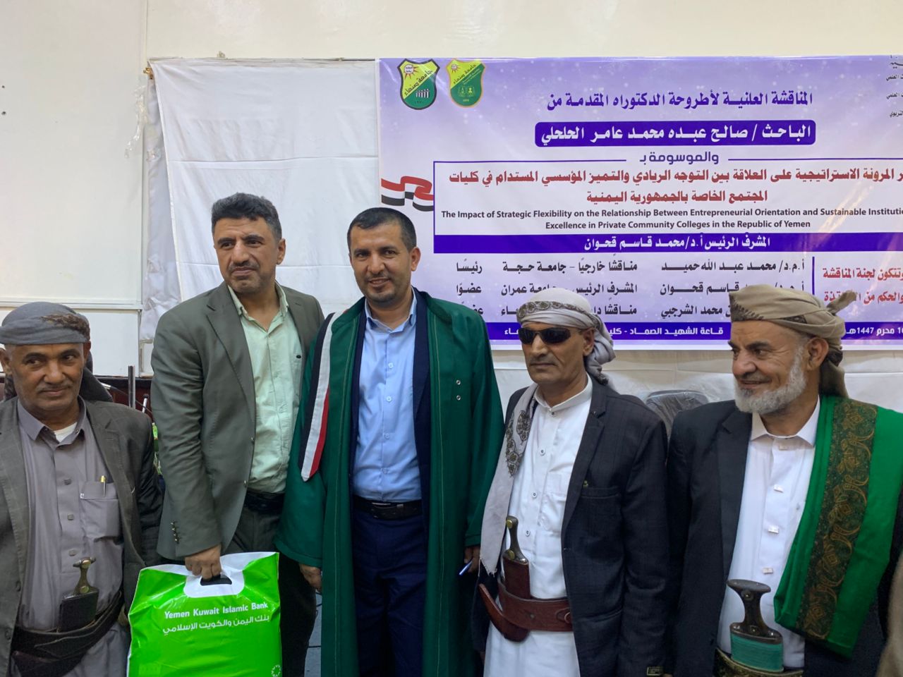 نال الباحث صالح عبده محمد عامر الحلحلي درجة الدكتوراه من قسم الإدارة والتخطيط التربوي بكلية التربية – جامعة صنعاء عن أطروحته الموسومة بـ “أثر المرونة الاستراتيجية على العلاقة بين التوجه الريادي والتميز المؤسسي المستدام في كليات المجتمع الخاصة بالجمهورية اليمنية” يوم السبت 10 محرم 1447هـ الموافق 5/7/2025م.