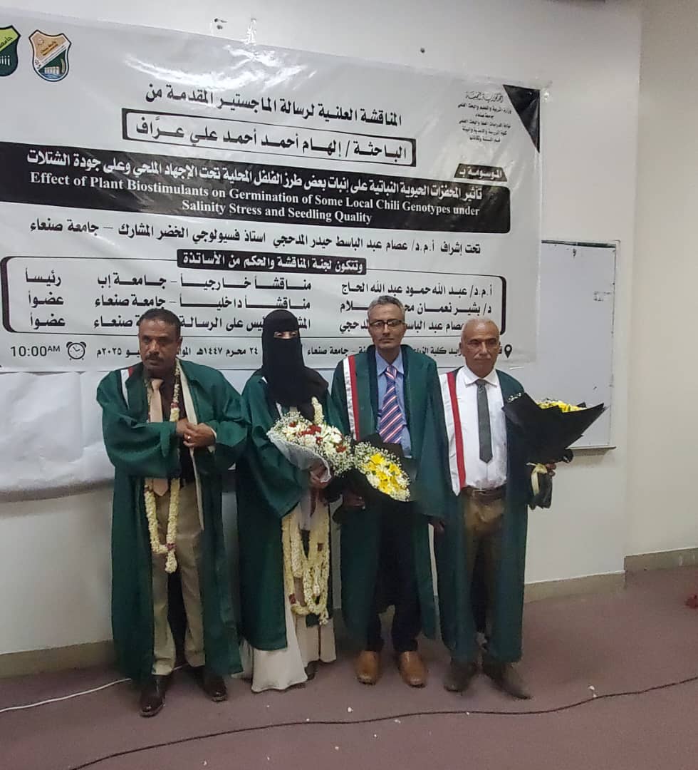 نالت الباحثة إلهام أحمد أحمد علي عراف درجة الماجستير من كلية الزراعة والأغذية والبيئة تخصص الخضر بدرجة امتياز مع مرتبة الشرف وذلك بعد مناقشتها العلنية يوم السبت 24 محرم 1447هـ، الموافق 19 يوليو 2025م، عن رسالتها الموسومة بـ “تأثير المحفزات الحيوية النباتية على إنبات بعض طرز الفلفل المحلية تحت الإجهاد الملحي وعلى جودة الشتلات”.