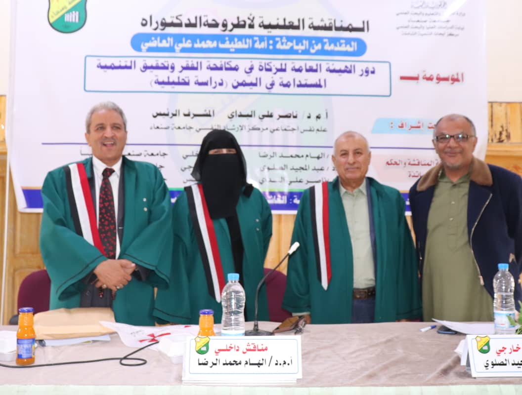 نالت الباحثة امة اللطيف محمد علي العاضي درجة الدكتوراه تخصص دراسات في التنمية الدولية من مركز أبحاث التنمية الشاملة بجامعة صنعاء، عن رسالتها الموسومة بـ “دور الهيئة العامة للزكاة في مكافحة الفقر وتحقيق التنمية المستدامة في اليمن” وذلك يوم الأحد الموافق ٣ أغسطس ٢٠٢٥م.