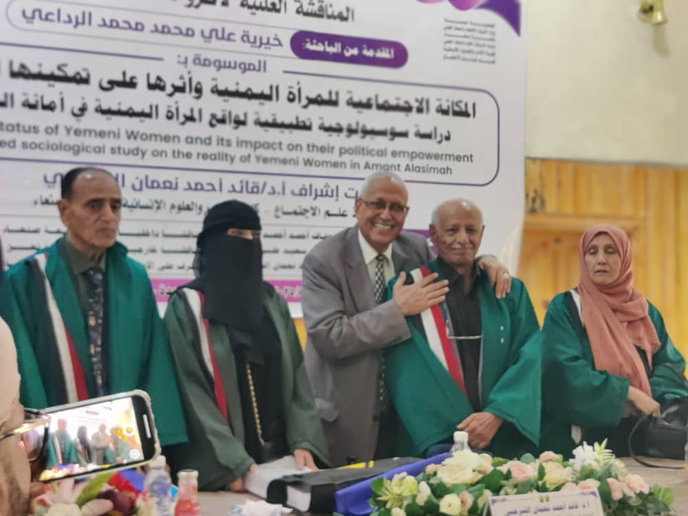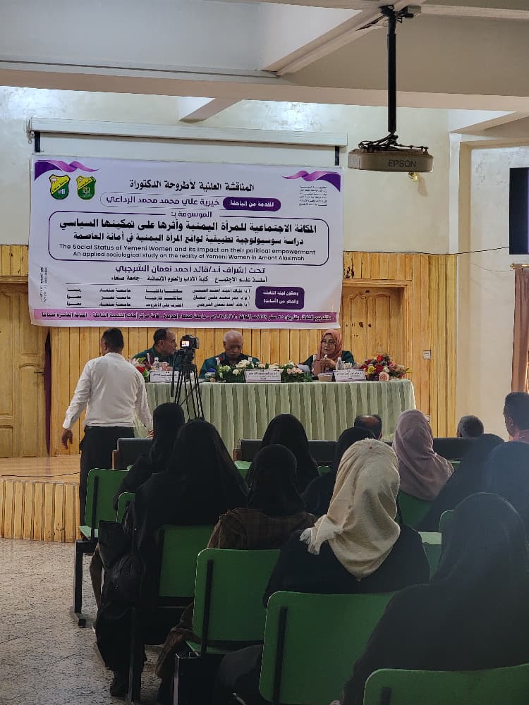 نالت الباحثة خيرية علي محمد الرداعي درجة الدكتوراه في علم الاجتماع تخصص علم اجتماع المرأة من قسم علم الاجتماع، كلية الآداب والعلوم الإنسانية بجامعة صنعاء، على رسالتها الموسومة بـ “المكانة الاجتماعية للمرأة اليمنية وأثرها على تمكينها السياسي: دراسة سوسيولوجية تطبيقية لواقع المرأة اليمنية في أمانة العاصمة” وذلك يوم الثلاثاء 25/صفر/1447 الموافق 19/8/2025.