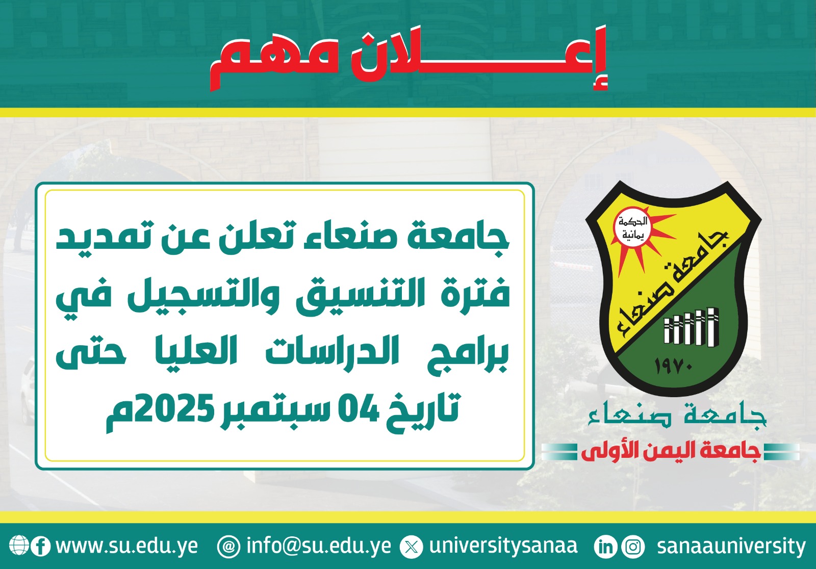 تعلن جامعة صنعاء عن تمديد فترة التنسيق والتسجيل في برامج الدراسات العليا ( الماجستير ) حتى 4 سبتمبر 2025م.