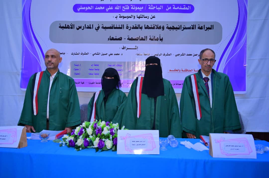 نالت الباحثة ميمونة فتح الله علي محمد الحوصلي الماجستير في الإدارة والتخطيط التربوي بتقدير ممتاز وبنسبة 95% من كلية التربية بجامعة صنعاء يوم السبت 22/صفر/1447هـ الموافق 2025/8/16م عن رسالتها الموسومة بـ “البراعة الإستراتيجية وعلاقتها بالقدرة التنافسية في المدارس الأهلية بأمانة العاصمة – صنعاء”.