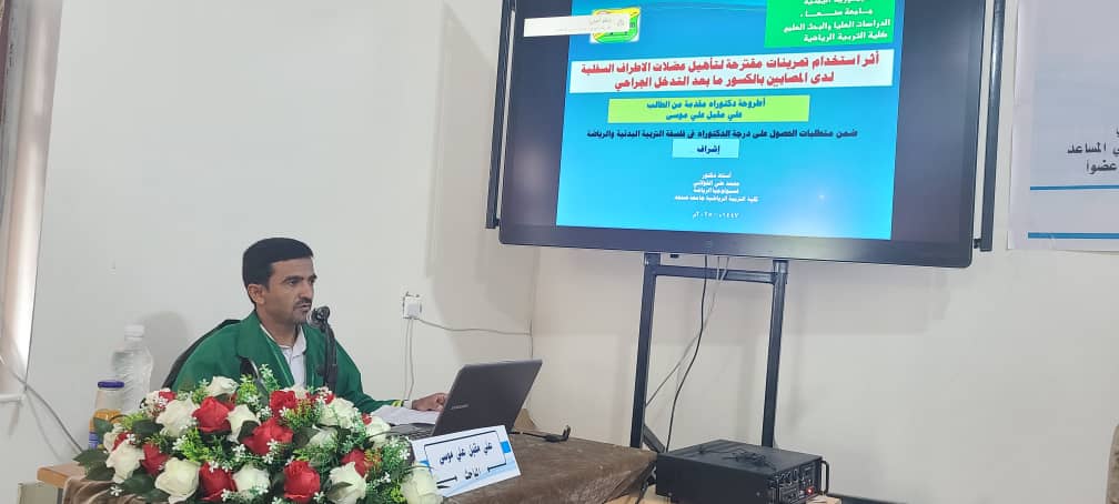 نال الباحث علي مقبل علي موسى درجة الدكتوراه في الفلسفة بعلوم التربية الرياضية، قسم التربية الرياضية، من كلية التربية الرياضية، بجامعة صنعاء، عن أطروحته الموسومة بـ “أثر استخدام تمرينات مقترحة لتأهيل عضلات الأطراف السفلية لدى المصابين بالكسور ما بعد التدخل الجراحي”. وذلك يوم الخميس 26 ربيع أول 1447هـ الموافق 18 سبتمبر 2025م.