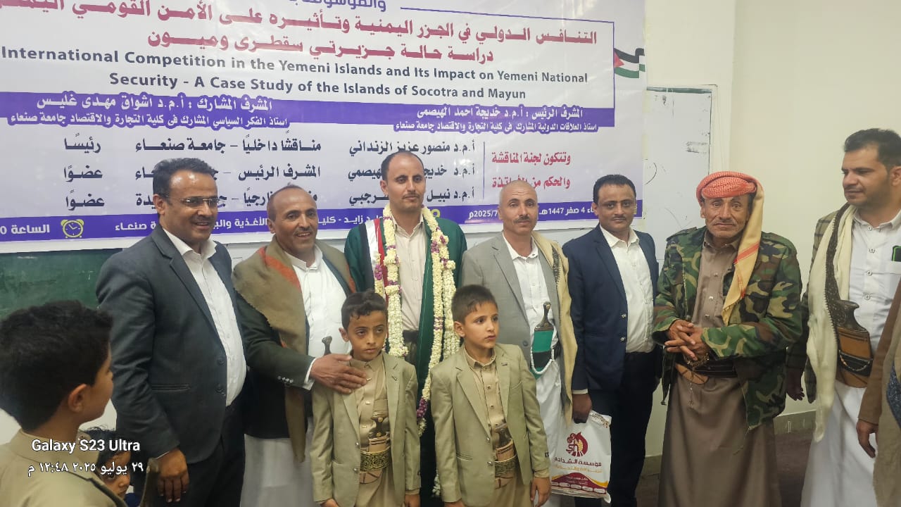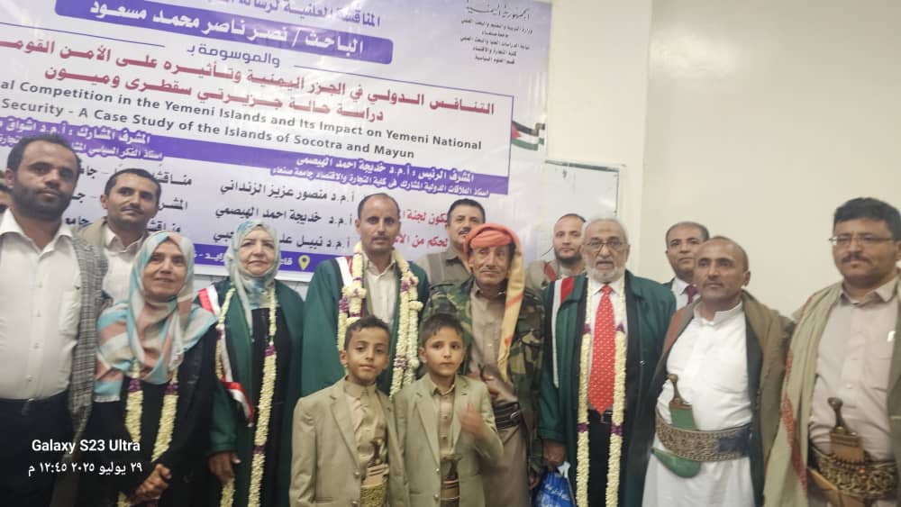 نال الباحث نصر ناصر محمد مسعود درجة الماجستير في العلوم السياسية بتقدير عام (ممتاز) بنسبة (90%) من كلية التجارة والاقتصاد بجامعة صنعاء، عن رسالته الموسومة بـ “التنافس الدولي في الجزر اليمنية وتأثيره على الأمن القومي اليمني دراسة حالة جزيرتي سقطرى وميون” يوم الثلاثاء 29-7-2025 الموافق 4 صفر 1447.