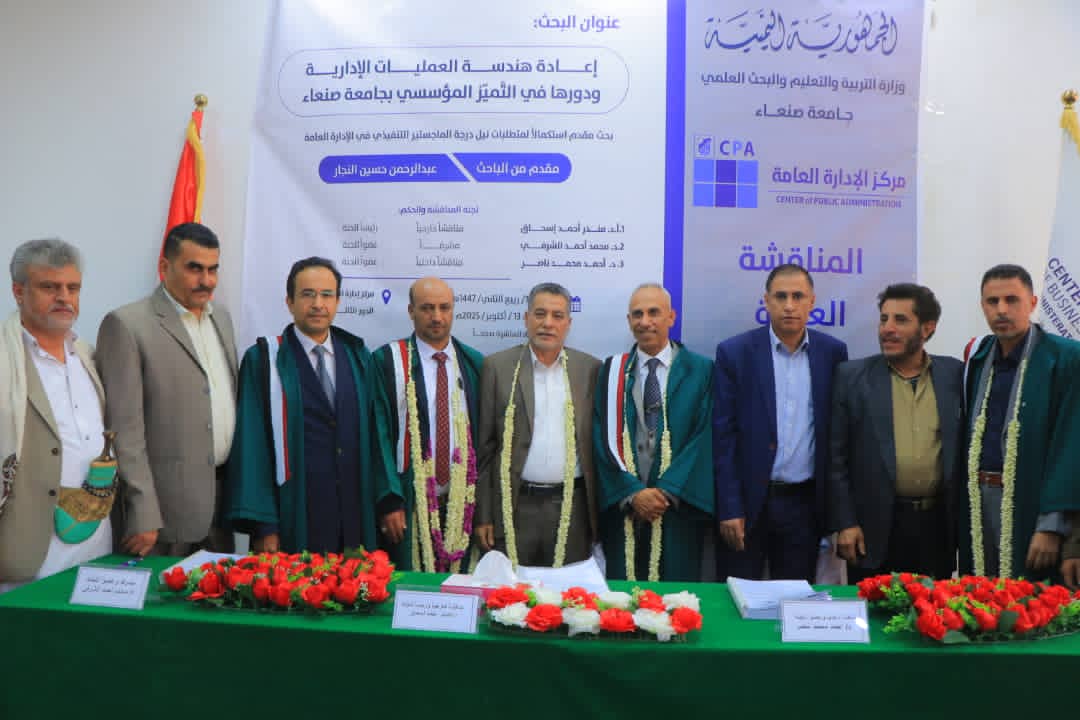 نال الباحث عبد الرحمن حسين قاسم النجار درجة الماجستير التنفيذي في الإدارة العامة من مركز الإدارة العامة بجامعة صنعاء عن رسالته الموسومة بـ “إعادة هندسة العمليات الإدارية ودورها في التَّميّز المؤسسي بجامعة صنعاء”. يوم الإثنين 10/ربيع الثاني/1447 الموافق 13/أكتوبر/2025م.