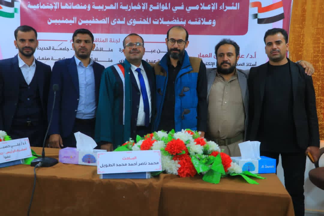 نال الباحث محمد ناصر أحمد محمد الطويل درجة الدكتوراه من كلية الإعلام – بجامعة صنعاء – تخصص الصحافة والنشر الإلكتروني، عن رسالته الموسومة بـ “الثراء الإعلامي في المواقع الإخبارية ومنصاتها الاجتماعية وعلاقته بتفضيلات المحتوى لدى الصحفيين اليمنيين” يوم الأربعاء 30 ربيع الآخر 1447هـ الموافق 22 أكتوبر 2025م،والتوصية بطباعة الرسالة وتداولها مع الجامعات الأخرى.