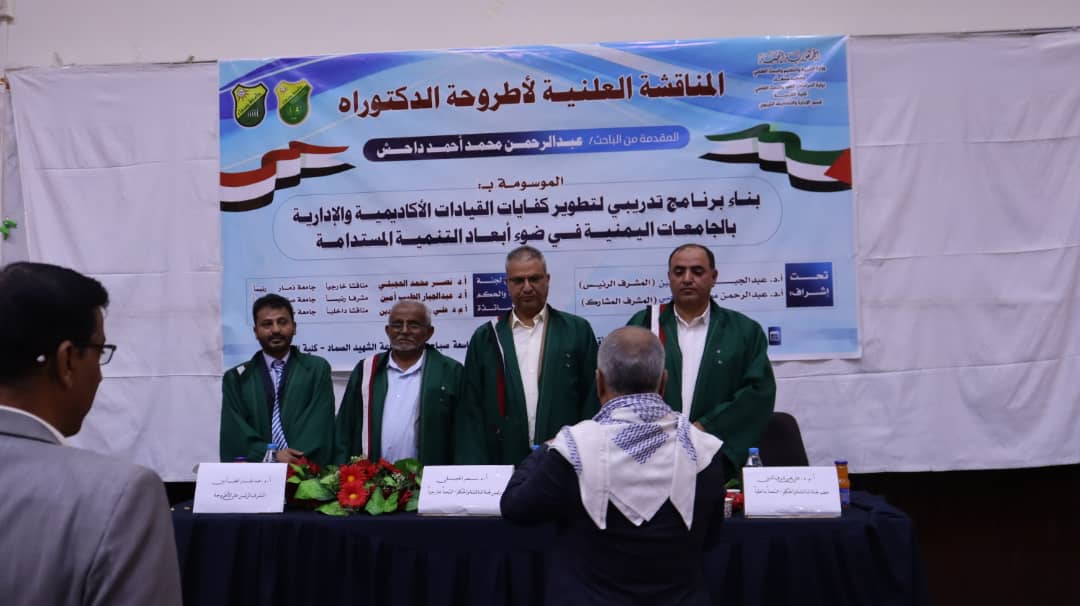 نال الباحث/ عبدالرحمن محمد أحمد داحش درجة الدكتوراه من قسم الإدارة والتخطيط التربوي بكلية التربية – جامعة صنعاء – عن أطروحته الموسومة بـ “بناء برنامج تدريبي لتطوير كفايات القيادات الأكاديمية والإدارية بالجامعات اليمنية في ضوء أبعاد التنمية المستدامة” يوم الأحد 11 جمادى الأولى 1447 هـ الموافق 3 نوفمبر 2025م.