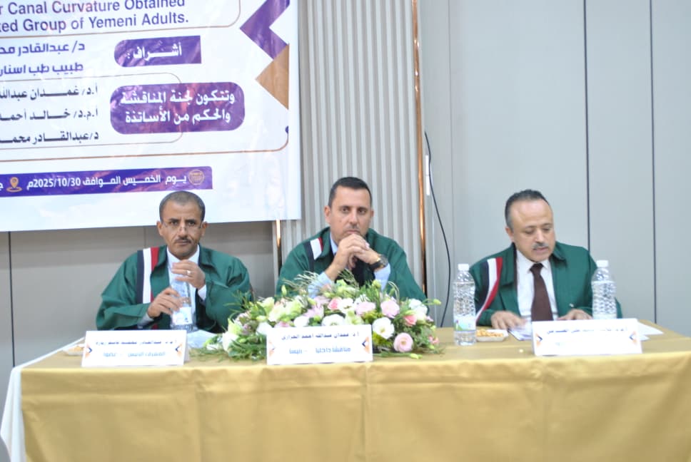 “موثوقية الزاوية الفكية وانحناء القناة السفلية بالتصوير الشعاعي البانورامي عند مجموعة مختارة من اليمنيين البالغين”، وذلك يوم الخميس الموافق 30/10/2025م.