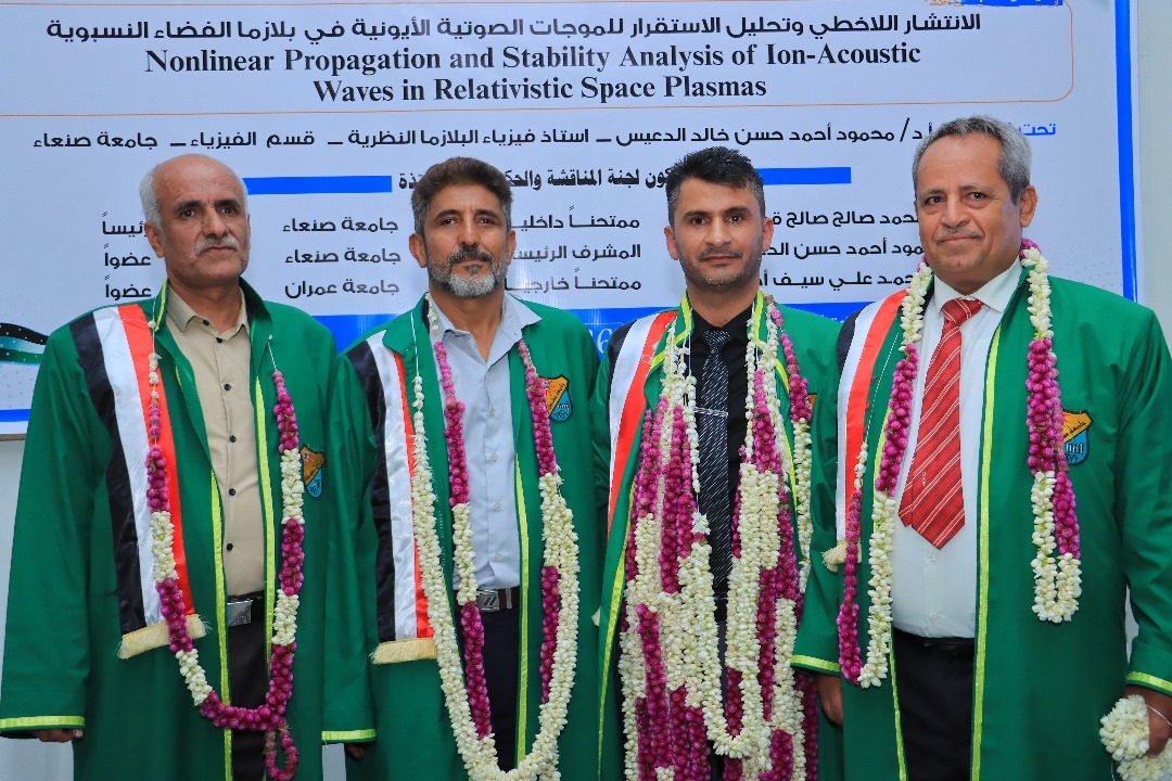 نال الباحث للماجستير هلال حسن إسماعيل علي الجوهري درجة الماجستير في قسم الفيزياء تخصص فيزياء كلية العلوم بجامعة صنعاء عن رسالته الموسومة بــــــ (الانتشار اللاخطي وتحليل الاستقرار للموجات الصوتية الأيونية في بلازما الفضاء النسبوية) يوم السبت 26/ربيع الثاني/1447 هـ الموافق 18/10/2025م.