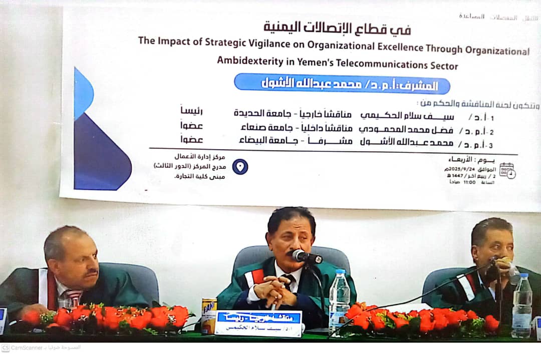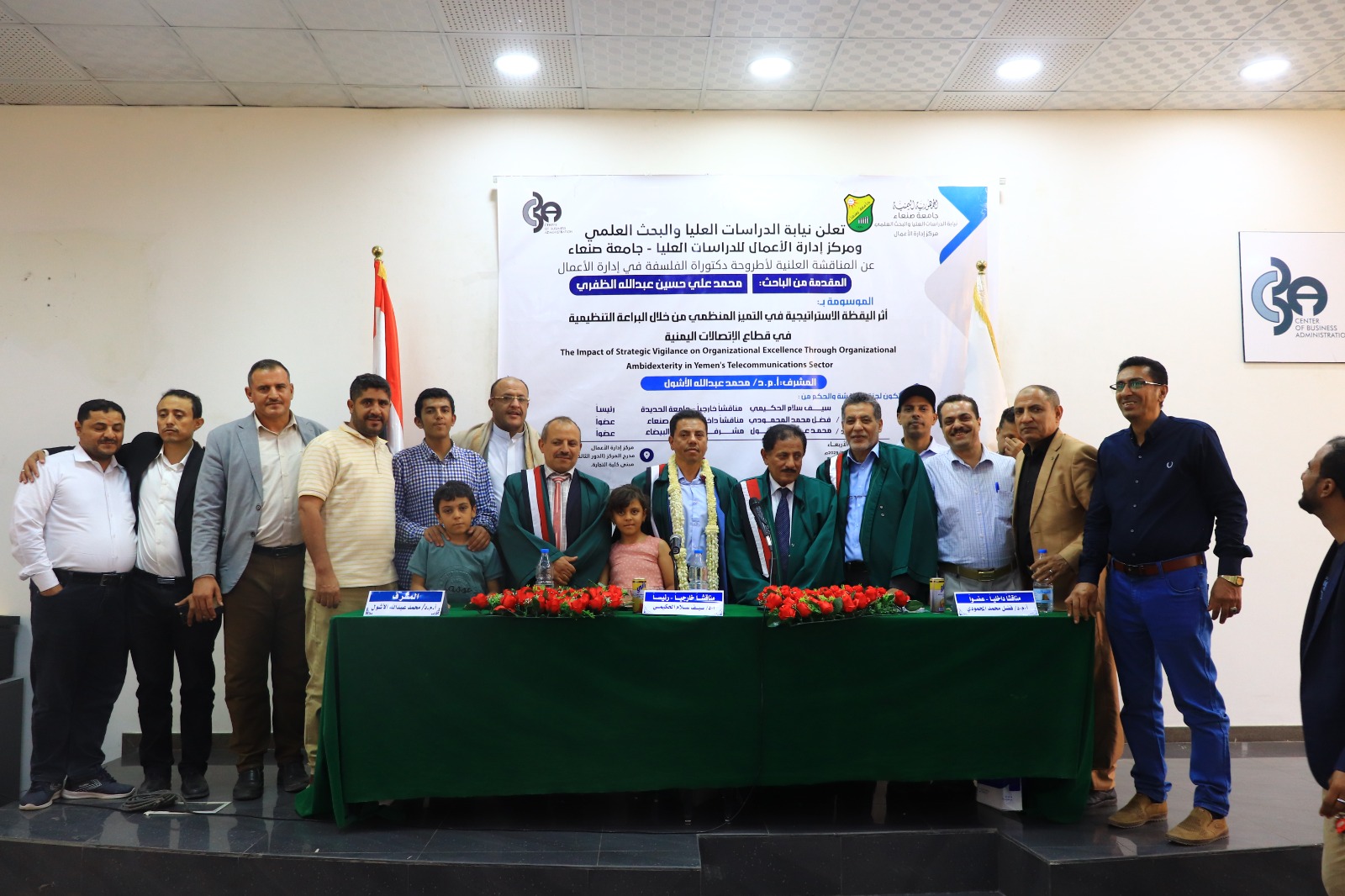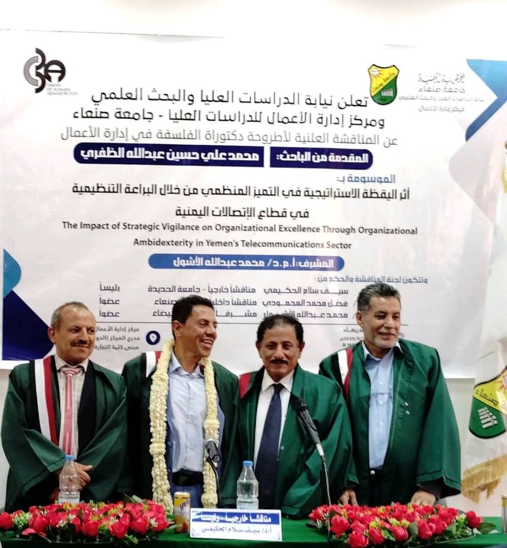 نال الباحث محمد علي حسين عبدالله الظفري درجة الدكتوراه في فلسفة إدارة الأعمال من مركز إدارة الأعمال للدراسات العليا بجامعة صنعاء، عن أطروحته بعنوان: “أثر اليقظة الاستراتيجية في التميز المنظمي من خلال البراعة التنظيمية في قطاع الاتصالات اليمنية”، وذلك يوم الأربعاء 2 ربيع الآخر 1447هـ الموافق 24/09/2025م.