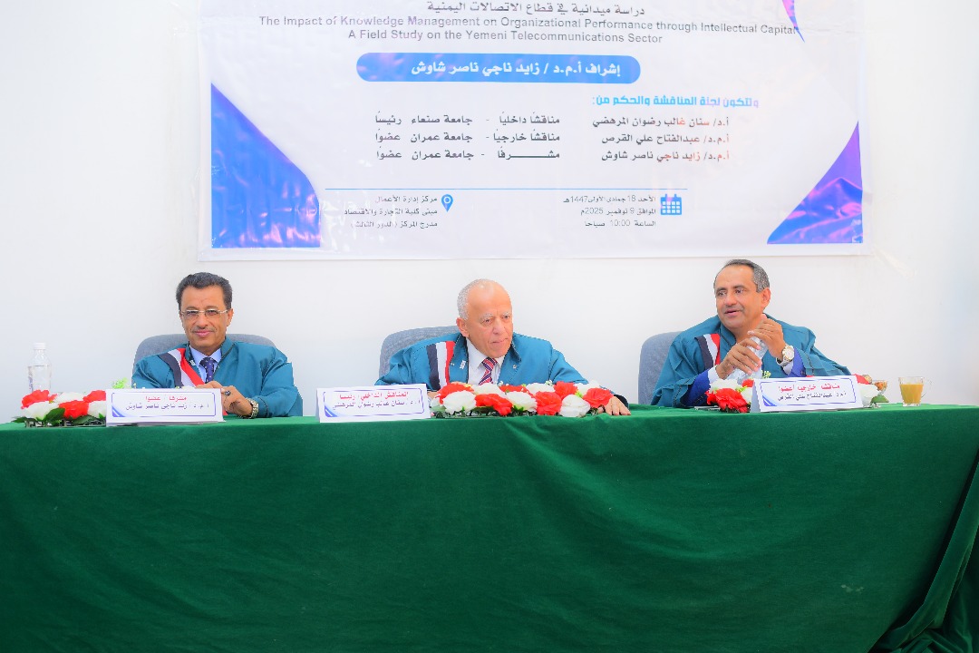 نال الباحث فضل علي محمد فاضل الربيعي، درجة الدكتوراه في فلسفة إدارة الأعمال، من مركز إدارة الأعمال للدراسات العليا بجامعة صنعاء عن أطروحته بعنوان: “أثر إدارة المعرفة على الأداء التنظيمي من خلال رأس المال الفكري: دراسة ميدانية في قطاع الاتصالات” يوم 19/5/1447هـ الموافق 9/11/2025م.