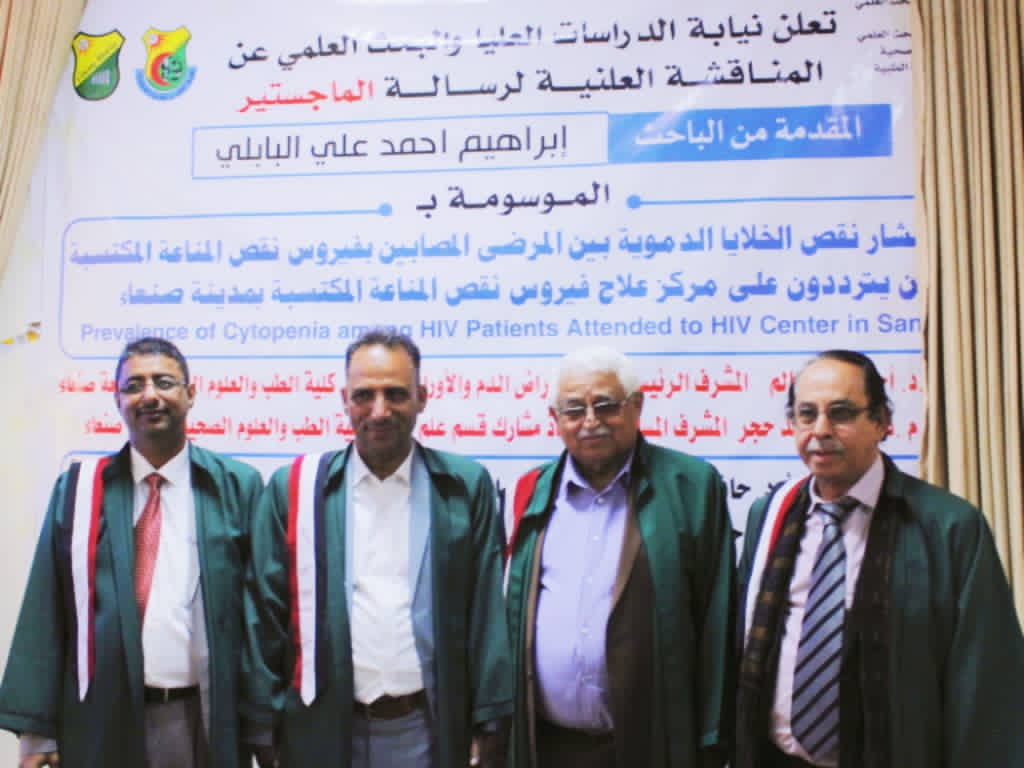 نال الباحث إبراهيم أحمد علي البابلي درجة الماجستير بتقدير جيد جداً في قسم علم الدم تخصص علم الدم ونقل الدم المخبري بكلية الطب والعلوم الصحية بجامعة صنعاء، عن رسالته الموسومة بـ (معدل انتشار الخلايا الدموية بين المرضى المصابين بفيروس نقص المناعة المكتسبة الذين يترددون على مركز علاج فيروس نقص المناعة المكتسبة بمدينة صنعاء)، وذلك يوم الأربعاء 10 ديسمبر 2025م – 19 جمادى الآخرة 1447هـ