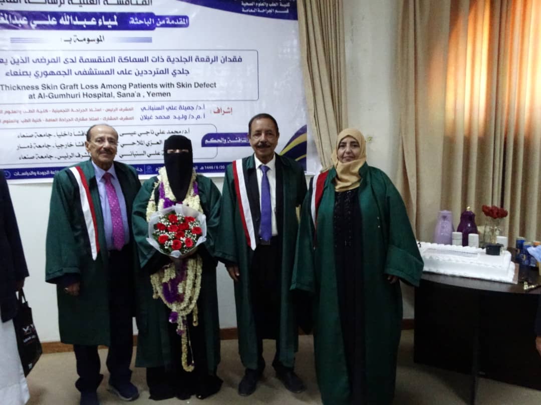 نالت الباحثة/ لمياء عبد الله علي عبد المغني درجة الماجستير بتقدير امتياز في قسم (الجراحة التجميلية) تخصص (الجراحة العامة) كلية (الطب والعلوم الصحية) بجامعة صنعاء عن رسالتها الموسومة بـ(فقدان الرقعة الجلدية ذات السماكة المنقسمة لدى المرضى الذين يعانون من قصور جلدي بالمستشفى الجمهوري بصنعاء) وذلك يوم الخميس 20 جمادى الآخرة 1447 هجري الموافق 11 ديسمبر 2025 م.