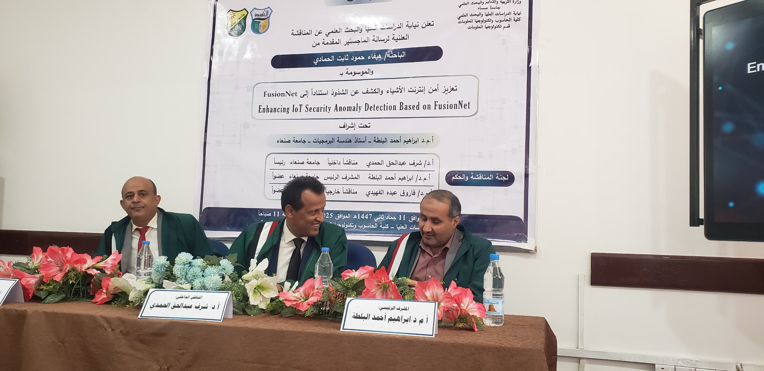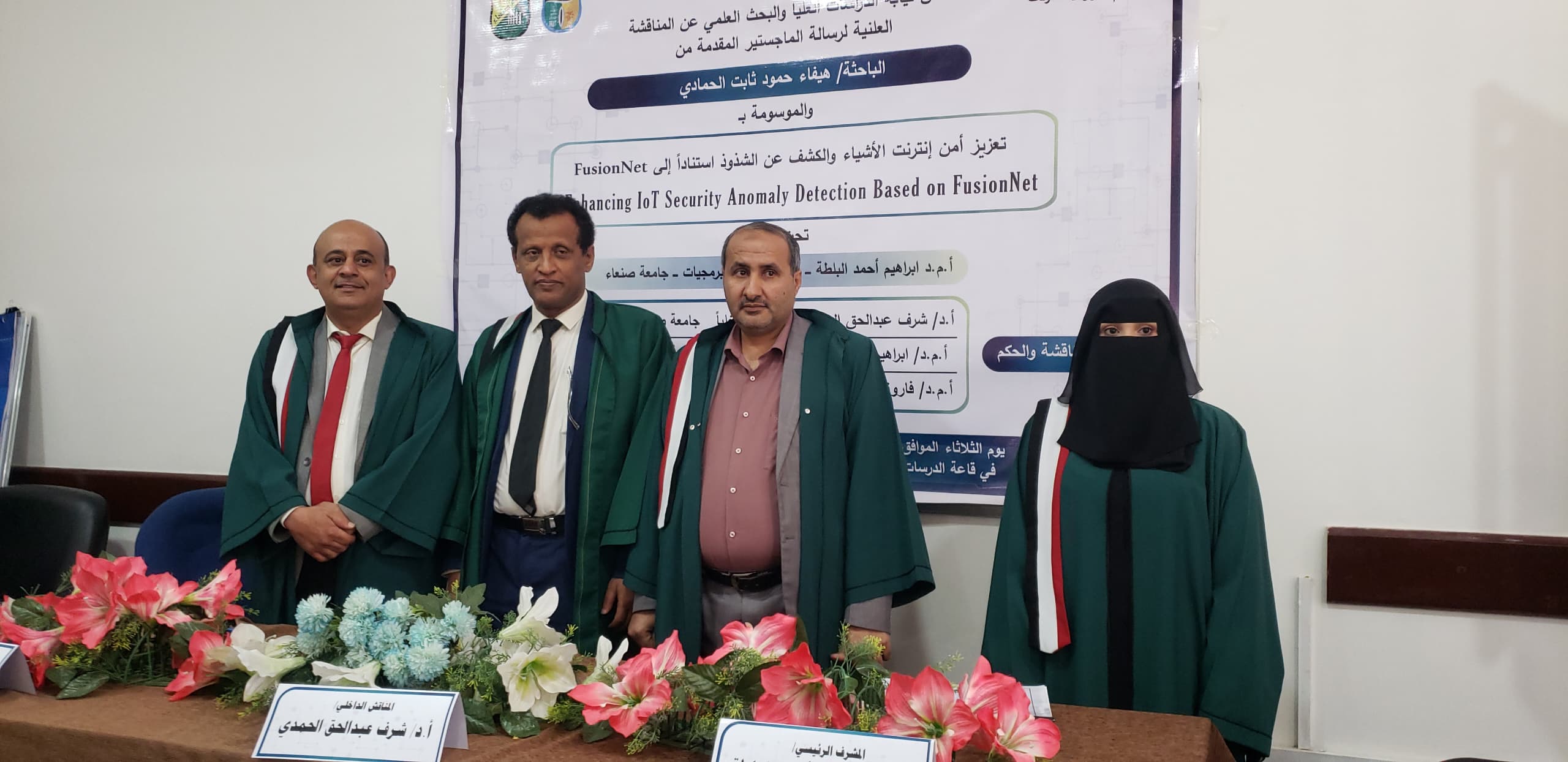 نالت الباحثة/ هيفاء حمود ثابت الحمادي درجة الماجستير من قسم (تكنولوجيا المعلومات) تخصص (تكنولوجيا المعلومات) كلية (الحاسوب وتكنولوجيا المعلومات) بجامعة صنعاء عن رسالتها الموسومة بـ(تعزيز أمن إنترنت الأشياء والكشف عن الشذوذ استناداً إلى FusionNet Enhancing IoT Security Anomaly Detection Based on FusionNet) يوم الثلاثاء 11/ جمادى الآخرة /1447هـ الموافق 2025/12/2 م.