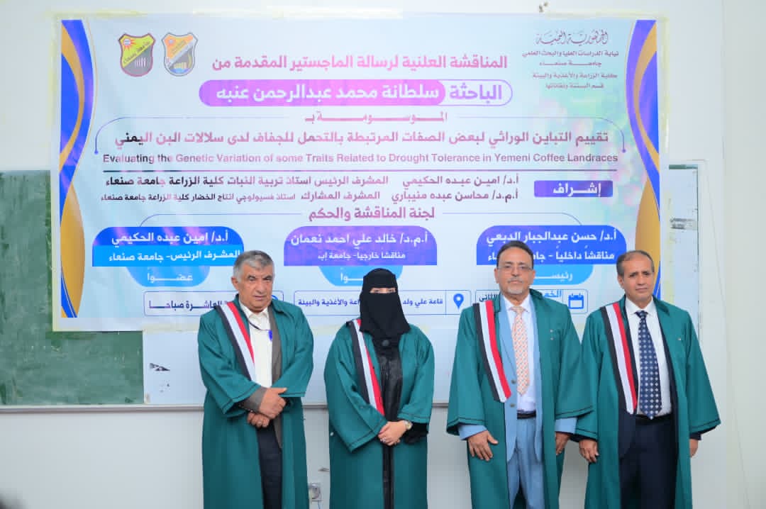 نالت الباحثة /سلطانة محمد عنبه درجة الماجستير بامتياز من قسم البساتين وتقاناتها بكلية الزراعة والأغذية والبيئة بجامعة صنعاء. عن رسالتها الموسومة بـ” تقييم التباين الوراثي لبعض الصفات المرتبطة بالتحمل للجفاف لدى سلالات البن اليمني Evaluating the Genetic Variation of some Traits Related to Drought Tolerance in Yemeni Coffee Landraces يوم الخميس 20 جمادى الآخرة 1447هـ الموافق 11 ديسمبر 2025 م.