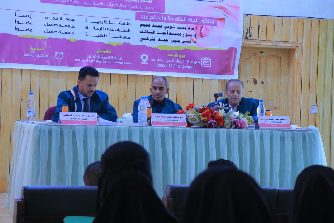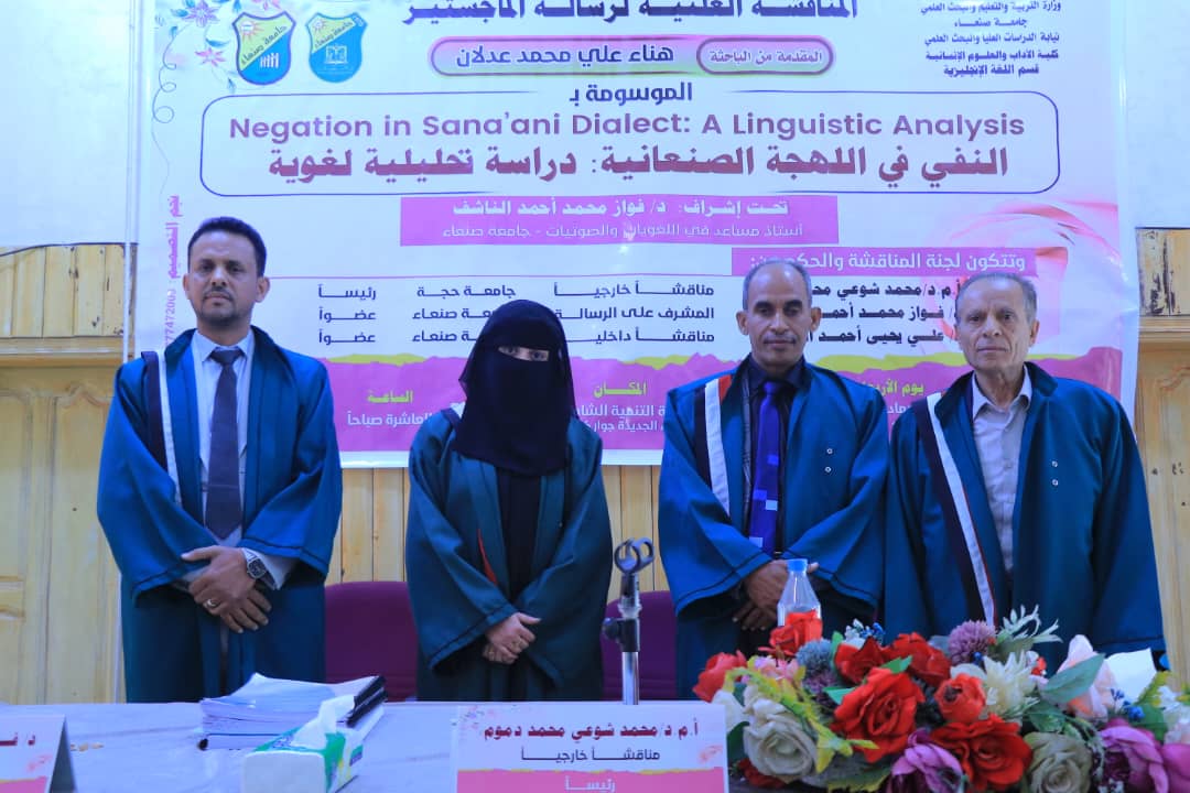 نالت الباحثة هناء علي محمد عدلان درجة الماجستير بدرجة (95%) وبتقدير “ممتاز”،من قسم اللغة الإنجليزية، تخصص لغويات، بكلية الآداب والعلوم الإنسانية – جامعة صنعاء، عن رسالتها الموسومة: “Negation in Sana’ani Dialect: A Linguistic Analysis النفي في اللهجة الصنعانية: دراسة تحليلية لغوية”.يوم الأربعاء 19 جمادى الآخر 1447هـ – الموافق 10 / 12 / 2025م ،كما أوصت اللجنة بنشر وتوزيع الرسالة في الجامعات والمكتبات اليمنية.