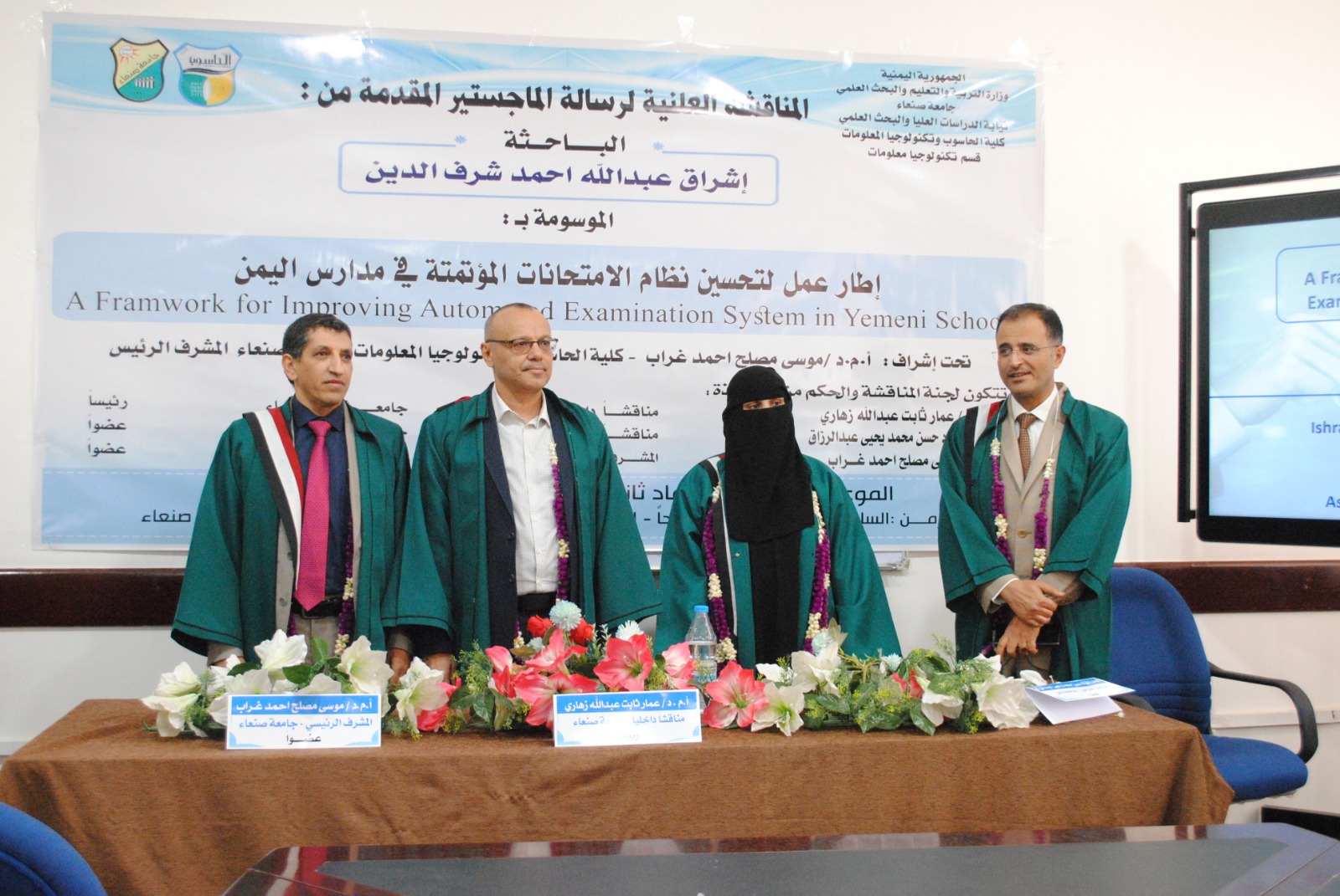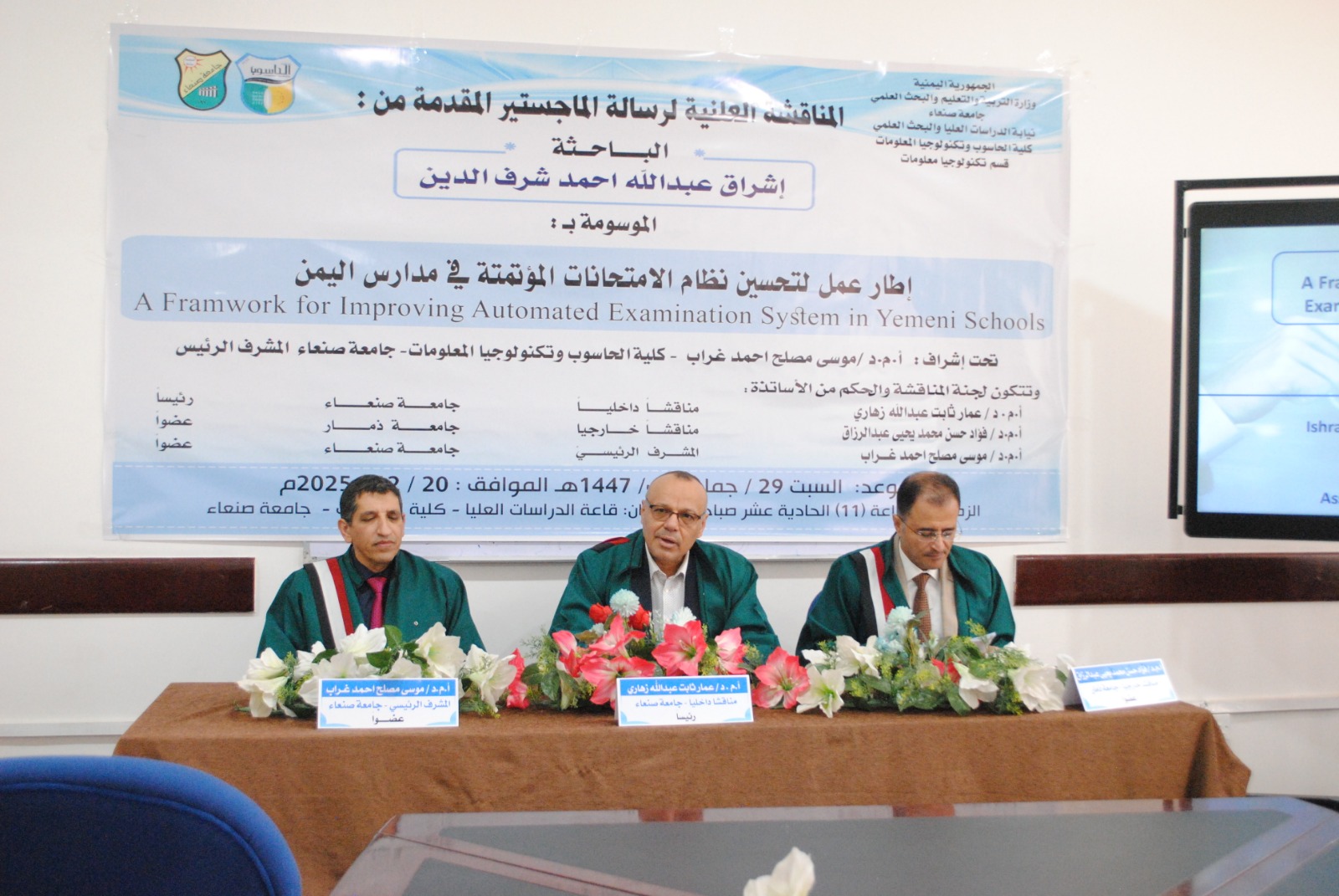 نالت الباحثة/ إشراق عبدالله أحمد شرف الدين درجة الماجستير من قسم (تكنولوجيا المعلومات)، تخصص (تكنولوجيا المعلومات)، بكلية (الحاسوب وتكنولوجيا المعلومات) – جامعة صنعاء، عن رسالتها الموسومة بـ (إطار عمل لتحسين الامتحانات المؤتمتة في مدارس اليمن)، وذلك يوم السبت، بتاريخ 29 جمادى الآخرة 1447هـ، الموافق 20/12/2025م.