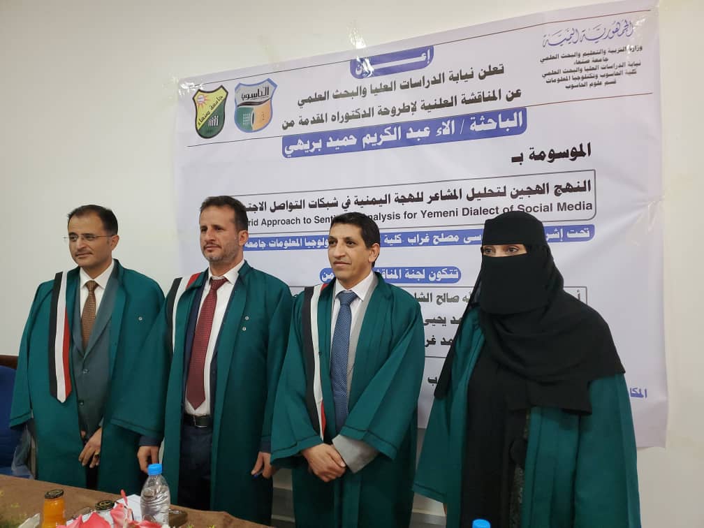 نالت الباحثة آلاء عبد الكريم حميد بريهي درجة الدكتوراه في الحوسبة وعلم المعلومات، قسم (علوم الحاسوب)، تخصص (علوم الحاسوب)، كلية (الحاسوب وتكنولوجيا المعلومات) بجامعة صنعاء، عن أطروحتها الموسومة بـ