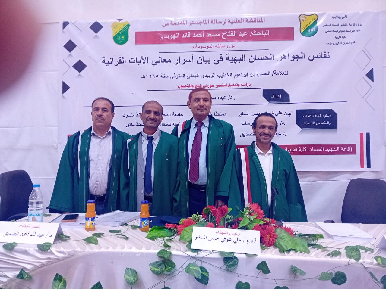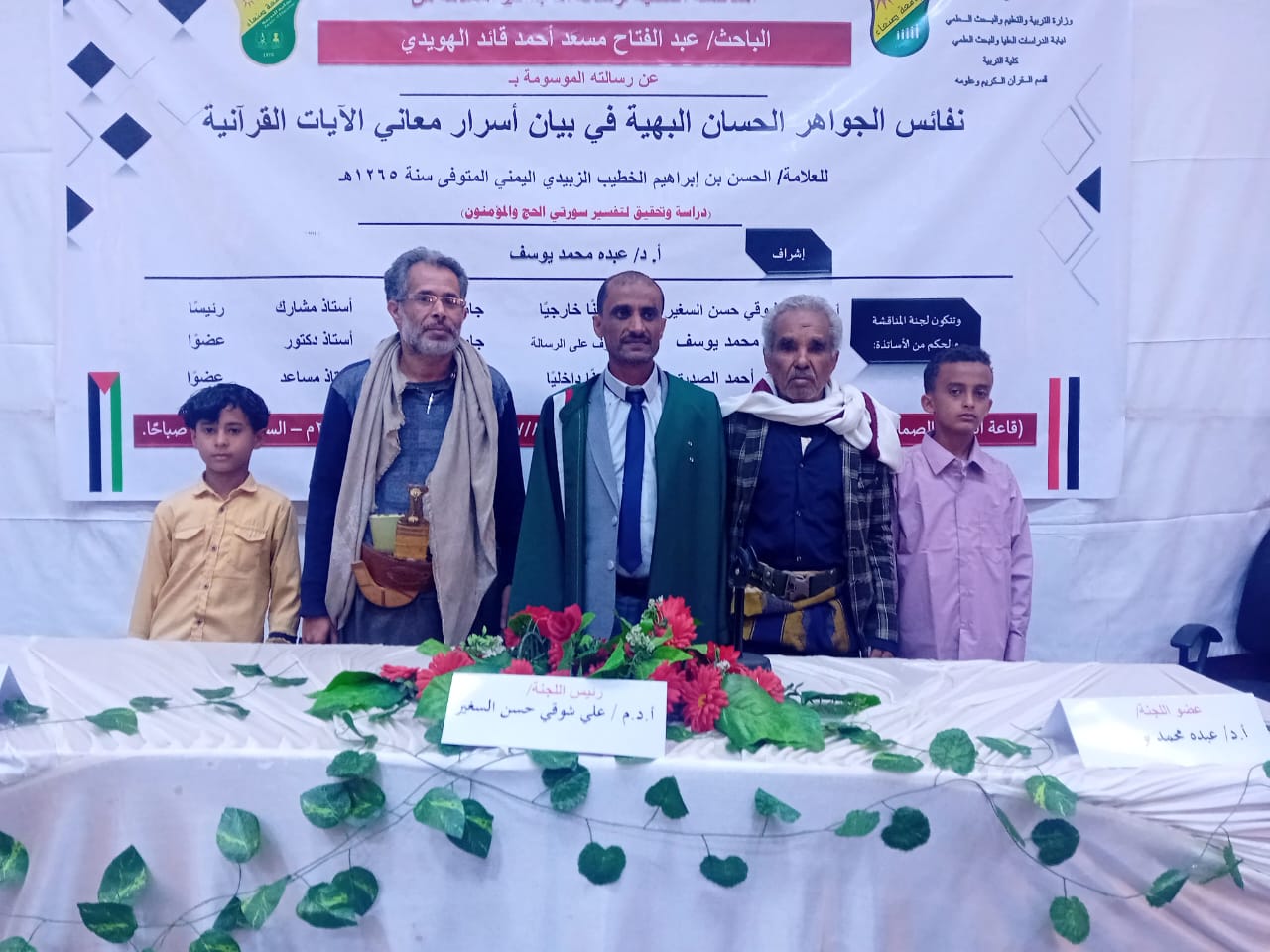 نال الباحث عبدالفتاح مسعد أحمد الهويدي درجة الماجستير في قسم علم القرآن الكريم وعلومه بتقدير ممتاز من كلية التربية بجامعة صنعاء يوم الخميس 3/شعبان/1447هـ الموافق 2026/1/22م عن رسالته الموسومة بـ “نفائس الجواهر الحسان البهية في بيان أسرار معاني الآيات القرآنية للعلامة/الحسن بن إبراهيم الخطيب الزبيدي اليمني المتوفى سنة 1265 هـ دراسة وتحقيق سورتي الحج والمؤمنون”.