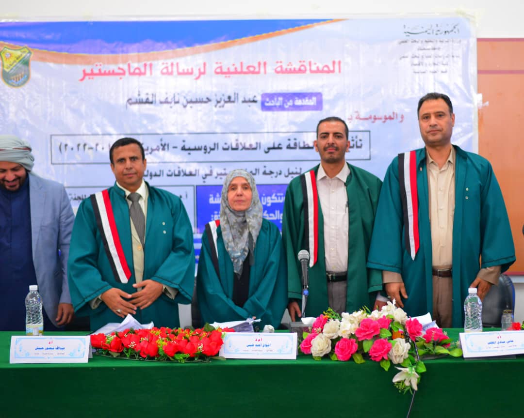 نال الباحث عبدالعزيز حسين علي نايف القشم درجة الماجستير في العلوم السياسية من كلية التجارة والاقتصاد بجامعة صنعاء، بتقدير ممتاز (95%)، مع مرتبه الشرف و توصية بطباعة الرسالة وترجمتها على نفقة الجامعة وتداولها مع الجامعات العربية والمحلية والخارجية، وذلك يوم الثلاثاء ٣٠ شعبان 1447هـ الموافق ١٧ فبراير 2026م حيث جاءت رسالته بعنوان: «تأثير امن الطاقه على العلاقات الروسيه الأمريكية ٢٠١١_٢٠٢٢ ».