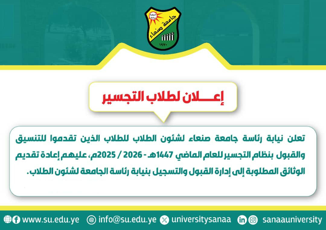 دعا نائب رئيس جامعة صنعاء لشؤون الطلاب الدكتور محمد علي شكري جميع الطلاب الذين تقدموا للتنسيق والقبول بنظام التجسير خلال العام الماضي 1447هـ – 2025/2026م إلى سرعة إعادة تقديم الوثائق المطلوبة إلى إدارة القبول والتسجيل بنيابة رئاسة الجامعة لشؤون الطلاب، وذلك لاستكمال الإجراءات المتعلقة بطلباتهم.