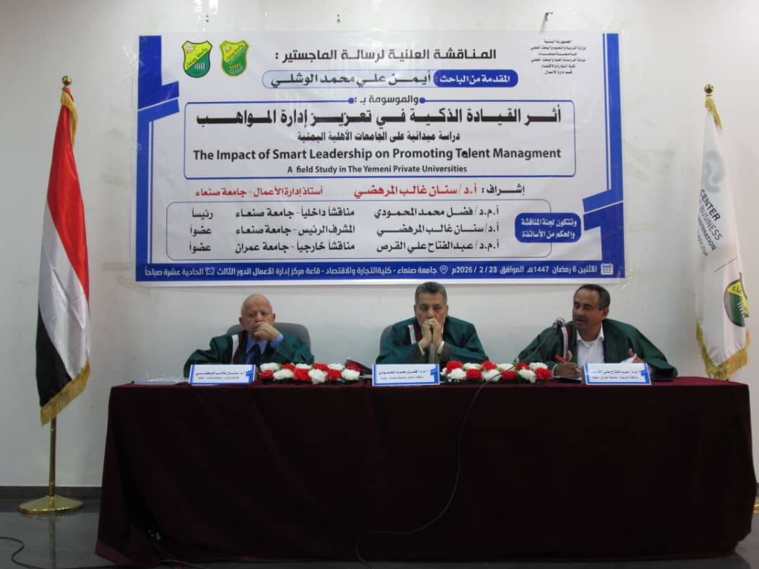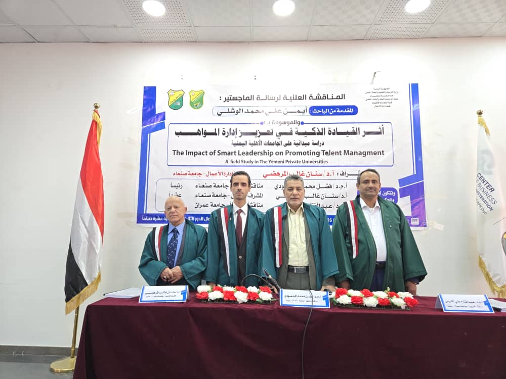 نال الباحث أيمن علي محمد الوشلي درجة الماجستير في إدارة الأعمال من كلية التجارة والاقتصاد بجامعة صنعاء، بتقدير ممتاز (95%) ، عن رسالته الموسومة ب” أثر القيادة الذكية في تعزيز إدارة المواهب – دراسة ميدانية على الجامعات الأهلية اليمنية ” وذلك يوم الاثنين 23 فبراير 2026 الموافق 6 رمضان 1447.