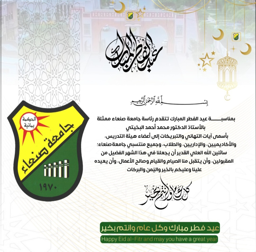 بمناسبة عيد الفطر المبارك تتقدم رئاسة جامعة صنعاء ممثلة بالأستاذ الدكتور محمد أحمد البخيتي،