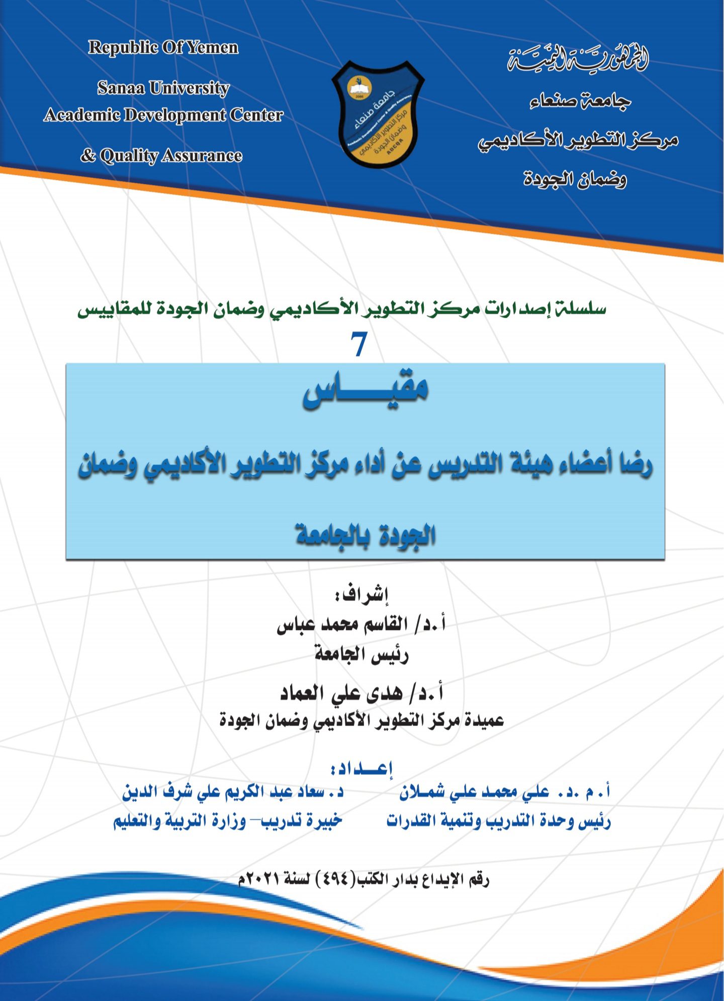 Evaluation Scale of Faculty Members’ Satisfaction with the Performance of the Academic Development and Quality Assurance Center at Sana’a University Posted by nasim Categories Center Publications Date August 10, 2024 للتحميل اضغط هنا https://su.edu.ye/ce/wp-content/uploads/sites/4/2024/08/7مقياس_رضا_أعضاء_هيئة_التدريس_عن_أداء_مركز_التطوير_الأكاديمي_وضمان_الجودة_بالجامعة.pdf Share: nasim Previous post Scale of the Faculty Members’ Training Needs August 10, 2024 Next post Executive Plan for Raising the Global Ranking of Sana'a University August 16, 2024 You may also like Performance Evaluation Scale of Academic Department Heads at University Faculties 20 August, 2024 Course Syllabus Profile and Course Report Form 20 August, 2024 Measurement of Students’ Satisfaction with Services Provided by Academic Counseling 20 August, 2024