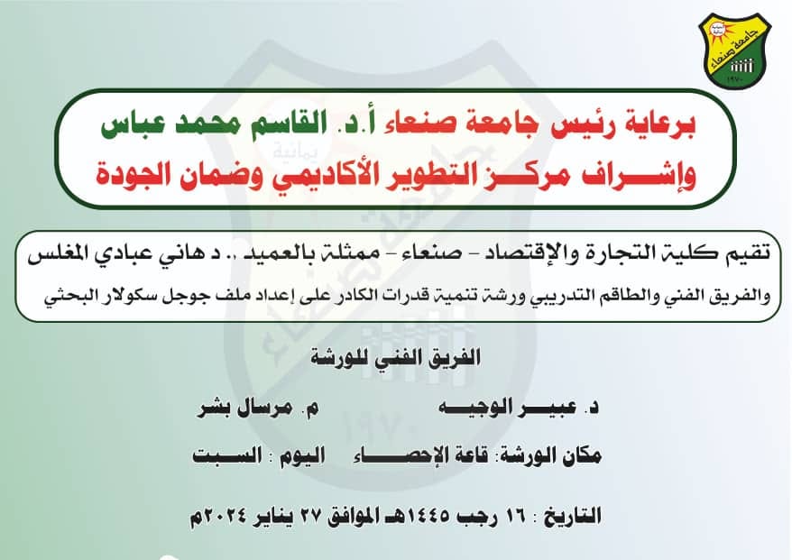 ضمن توجهات جامعة صنعاء وبرعاية رئيس الجامعة الاستاذ الدكتور القاسم محمد عباس وبٳشراف مركز التطوير الاكاديمي وحضور عمادة كلية التجارة والاقتصاد