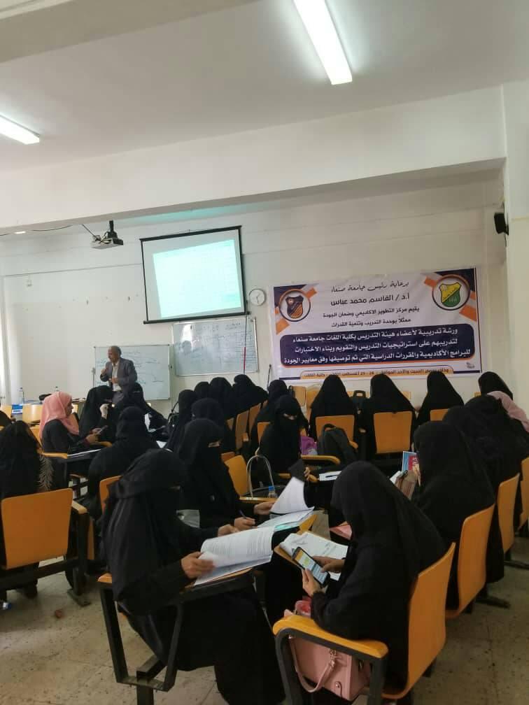أُقيمَت في صباح يوم السبت الساعة(8,30) بتاريخ 20 محرّم 1443هــ الموافق 28/8/2021م ورشة تدريبية لأعضاء هيئة التدريس بجامعة صنعاء ، وقد تناولت هذه الورشة عن استراتيجية التدريس والتقويم المتمثّلة في بناء الاختبارات التحصيلية وفق لائحة المواصفات. وقد افتتح عميد كلية اللغات الدكتور/ محمد الناصر هذه الورشة وحضور نائب العميد للدراسات العليا والبحث العلمي والشؤون الأكاديمية الدكتور/ عباس مطهر وكذا نائب العميد لشؤون الطلاب الدكتور/ مجاهد الصبري، وحضور رؤساء أقسام الكلية وأعضاء تدريس أقسامها(مرفق كشوفات التوقيع لأعضاء هيئة التدريس الحاضرين).