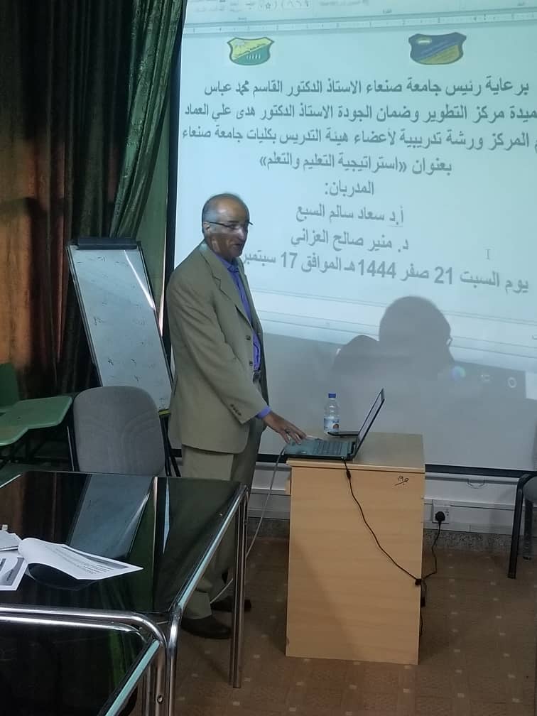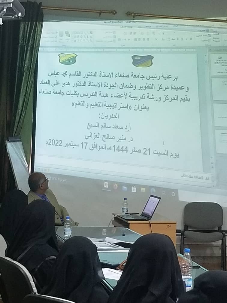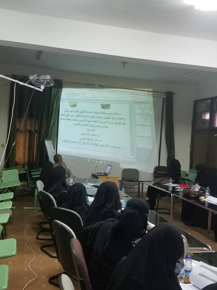 برعاية الأستاذ الدكتور القاسم محمد عباس رئيس جامعة صنعاء ومتابعة واشراف عميدة مركز التطوير وضمان الجودة أ.د هدى علي العماد أقامت وحدة التدريب والدعم الفني بمركز التطوير وضمان الجودة ورشة تدريبية بعنوان: (استراتيجية التعليم والتعلم) لبعض أعضاء هئية التدريس بكليات ومراكز الجامعة، وذلك يوم السبت الموافق 21صفر 1444هجري الموافق 17\9\2022م