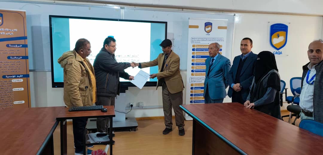 بتسليم التقرير النهائي لقيادة المجلس بحضور رئيس ا.د أحمد غالب الهبوب وا.د عبدالعزيز الشعيبي نائب رئيس المجلس والدكتورة هدى السنحاني مدير عام الاعتماد وذلك بعد استكمل اعداده من قبل الفريق والتأكد من الشواهد والأدلة والإطلاع على المرافق والتجهيزات ومحتويات البرنامج خلال الزيارة الميدانية للبرنامج.