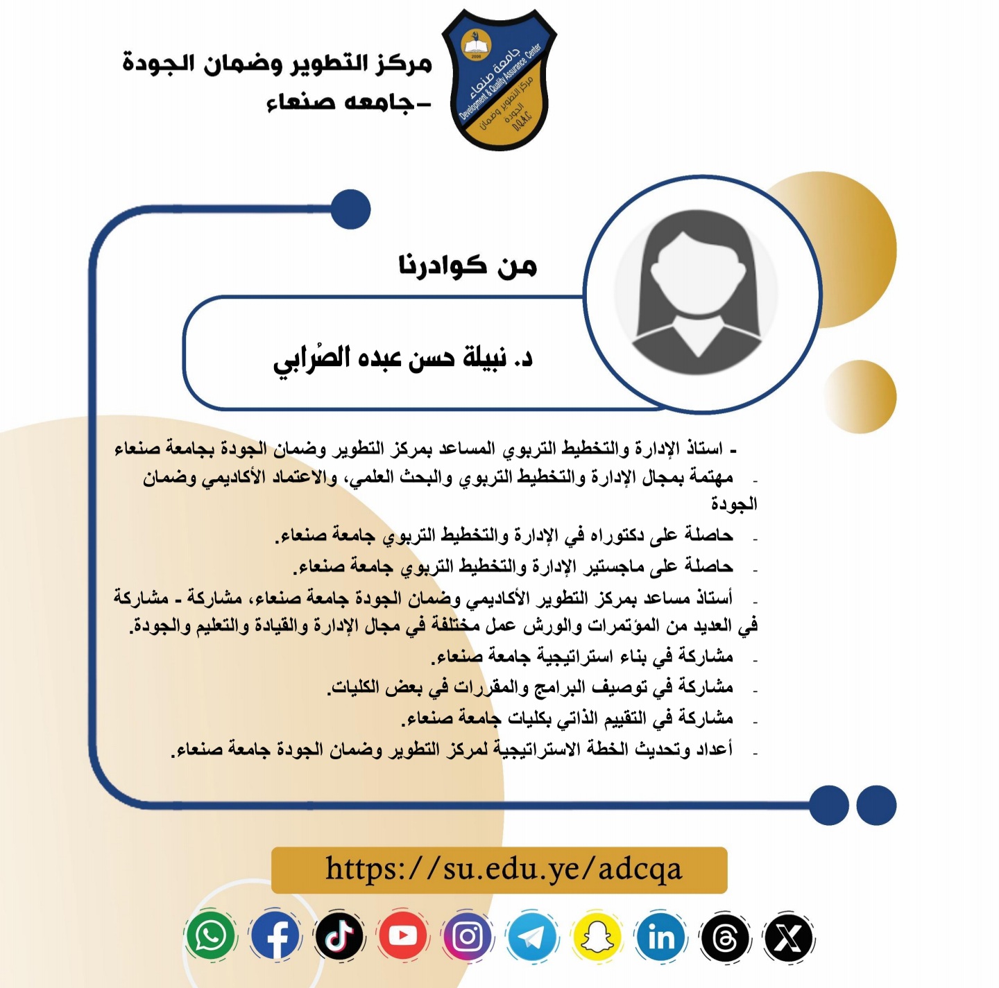 بطاقة تعريفية لإحدى كوادر مركز التطوير وضمان الجودة_ جامعة صنعاء
