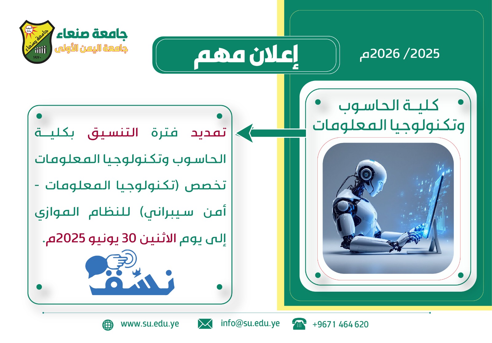 تعلن نيابة رئاسة شؤون الطلاب بجامعة صنعاء للطلاب المنسقين (نظام …