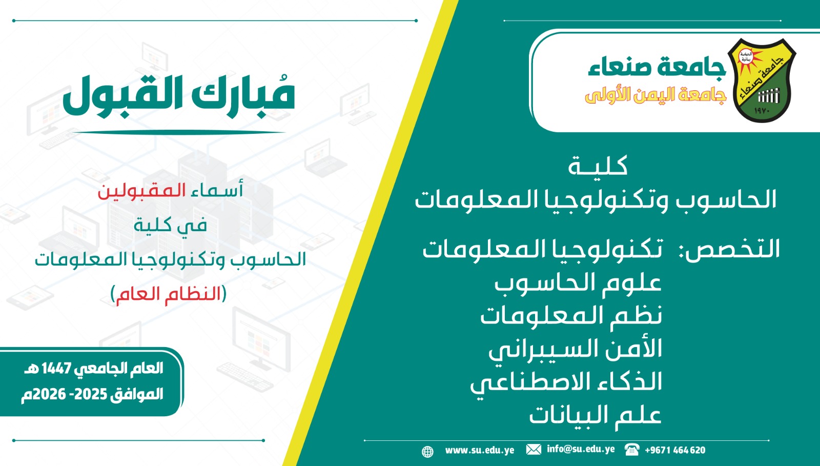 أعلنت جامعة صنعاء عن أسماء المقبولين في كلية الحاسوب بالنظام …
