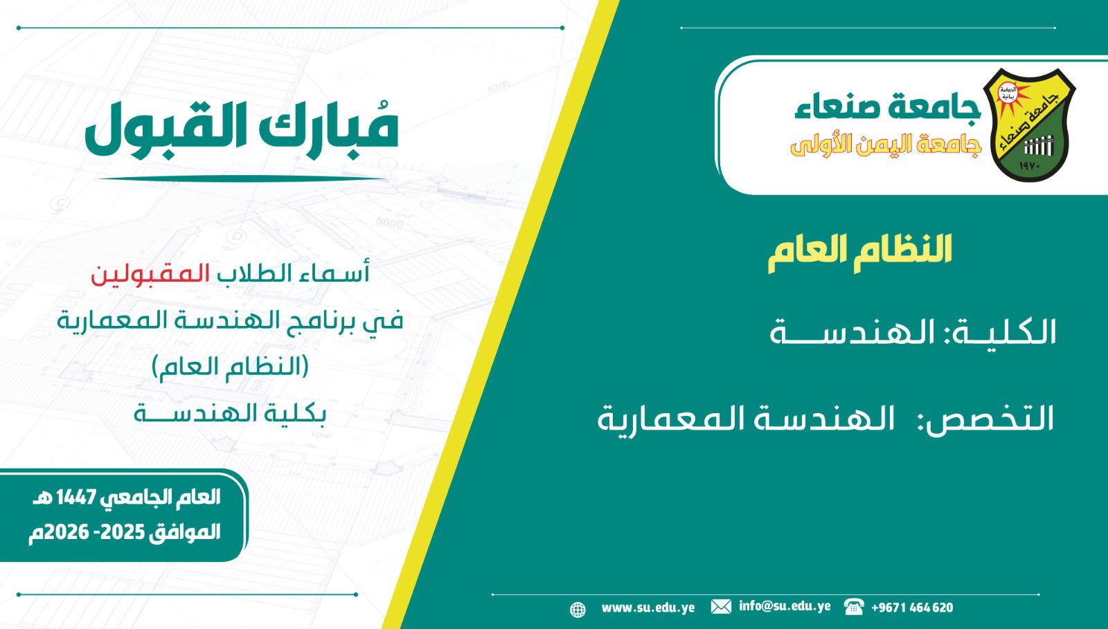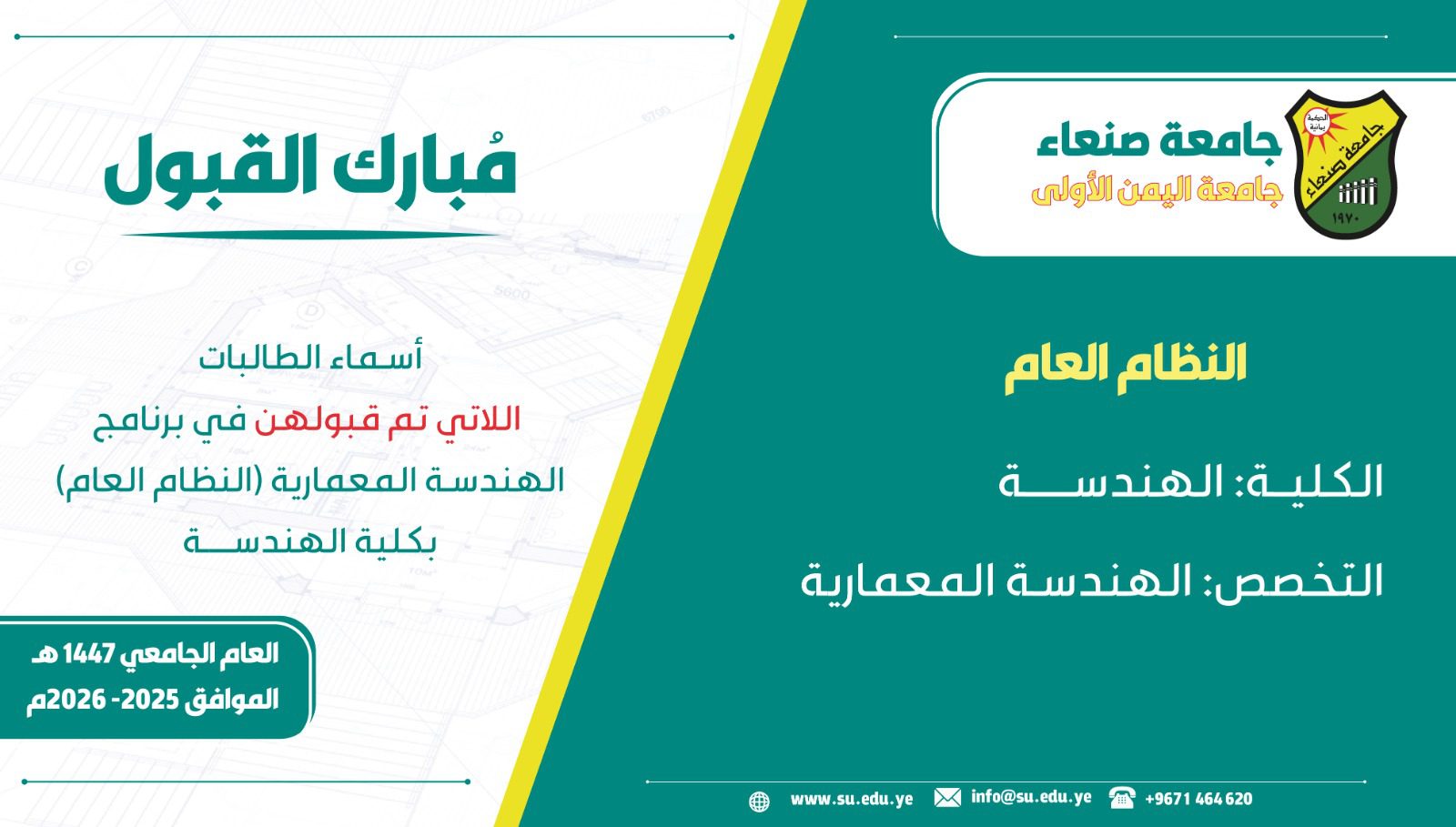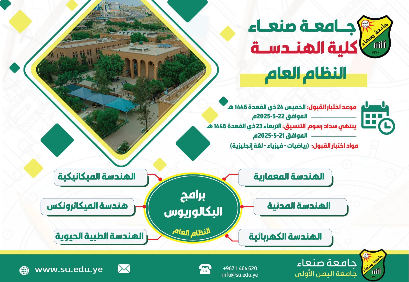 أعلنت جامعة صنعاء عن أسماء المقبولين في كلية الهندسة بالنظام …