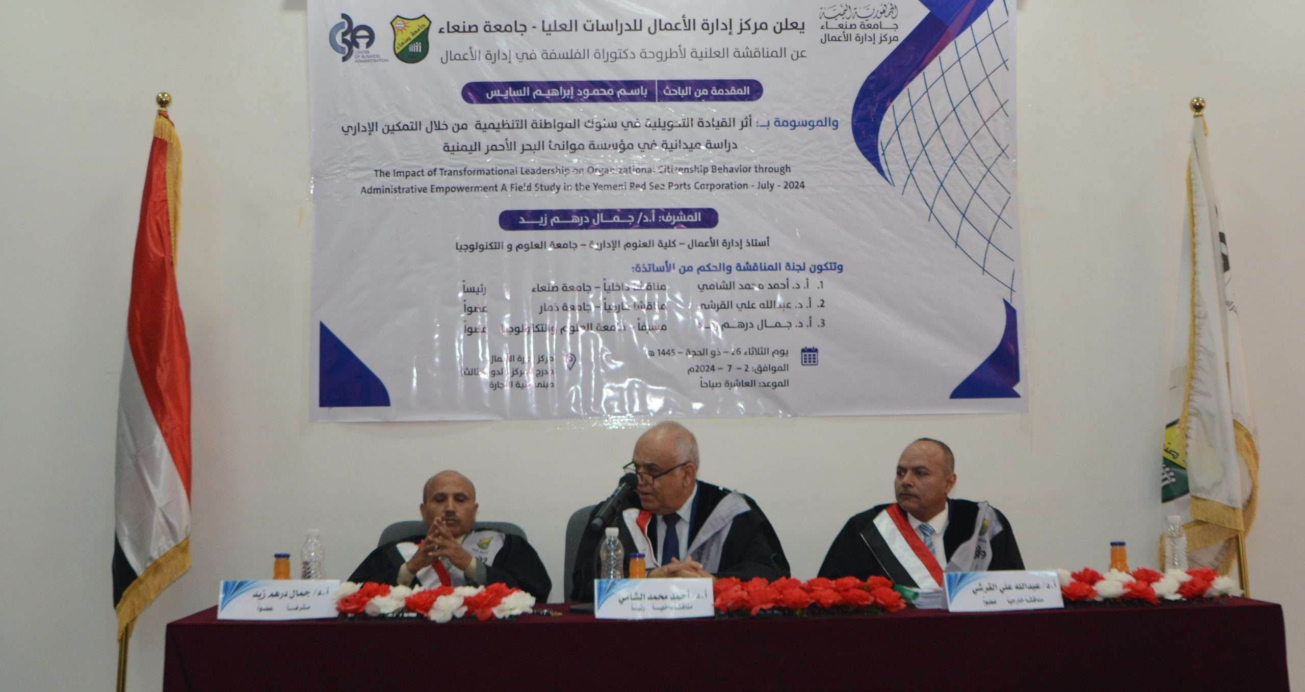 انعقدت صباح يوم الاثنين 2/ 07/ 2024م مناقشة اطروحة الدكتوراة في مركز إدارة الاعمال للدراسات العليا -جامعة صنعاء والمقدمة من الباحث / باسم محمود ابراهيم السايس ، والموسومة بـ: اثر القيادة التحويلية في سلوك المواطنة التنظيمية من خلال التمكين الإداري دراسة ميدانية في مؤسسة موانى البحر اليمنية ” وتكونت لجنة الحكم والمناقشة من :