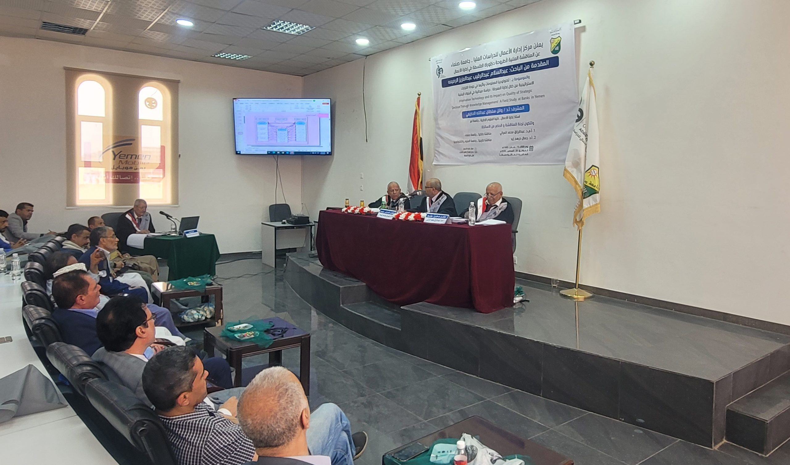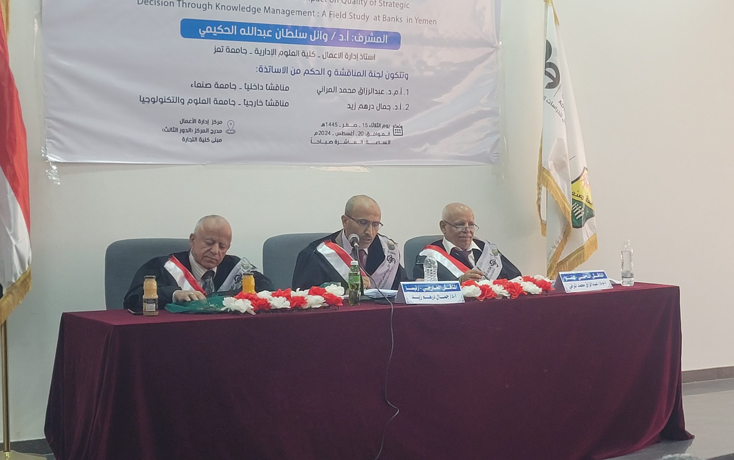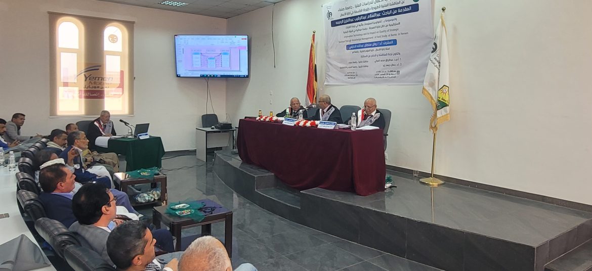 ناقش الباحث/ عبدالسلام عبدالرقيب عبدالعزيز الرميمة يوم الثلاثاء 15 صفر 1445هـ الموافق 20/ 08/ 2024م أطروحة الدكتوراه في فلسفة ادارة الاعمال، والموسومة بـ : تكنولوجيا المعلومات وأثرها في جودة القرارات الاستراتيجية من خلال إدارة المعرفة: دراسة ميدانية في البنوك اليمنية، وذلك بإشراف الاستاذ الدكتور / وائل سلطان الحكيمي.