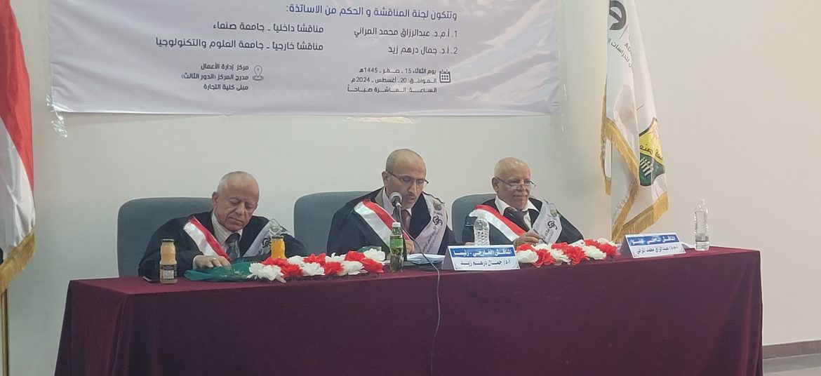 وفي بداية المناقشة التي حضرها عدد من الأكاديميين والباحثين، قام الباحث بعرض موجز عن أبرز مضامين أطروحته، مستعرضاً أبعاد الدراسة ومشكلتها واهدافها والأساليب والادوات التي استخدمها في جمع البيانات، وبعد ذلك قام أعضاء اللجنة بمناقشة الباحث وإبداء ملاحظاتهم وتصويباتهم على الأطروحة، وفي نهاية المناقشة أقرت لجنة المناقشة والحكم منح الباحث درجة الدكتوراه في فلسفة إدارة الأعمال من مركز إدارة الأعمال بجامعة صنعاء