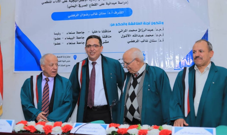 وقد أشادت لجنة المناقشة والحكم بالأطروحة، مؤكدة تميزها من حيث الإسهام العلمي، بوصفها إضافة نوعية وأصيلة إلى الأدبيات العلمية، لكونها تناولت بشكل تطبيقي الأثر التفاعلي للقيادة الاستراتيجية والإدارة الاستراتيجية على الأداء المنظمي، وهو جانب لم يحظَ باهتمام كافٍ في الدراسات السابقة. كما نوّهت اللجنة بالأهمية العملية للدراسة، لتركزها على القطاع المصرفي اليمني باعتباره قطاعًا حيويًا يواجه العديد من التحديات الاقتصادية والتنظيمية والتشغيلية، مشيرةً إلى أن نتائج الدراسة وتوصياتها المقترحة تمثل مرجعًا مهمًا ومفيدًا للقائمين على إدارة القطاع المصرفي وصنّاع القرار فيه.
