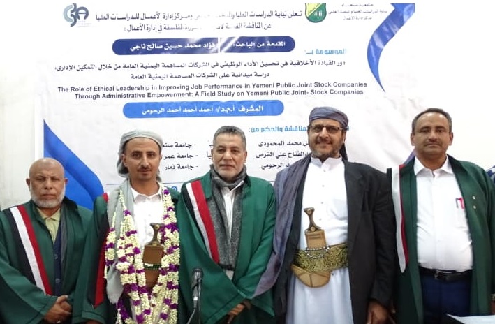 نال الباحث فؤاد محمد حسين صالح ناجي درجة الدكتوراة في فلسفة إدارة الأعمال من مركز إدارة الأعمال للدراسات العليا بجامعة صنعاء، وذلك عن اطروحته الموسومة بـ: دور القيادة الأخلاقية في تحسين الأداء الوظيفي في الشركات المساهمة اليمنية العامة من خلال التمكين الإداري: دراسة ميدانية على الشركات المساهمة اليمنية العامة