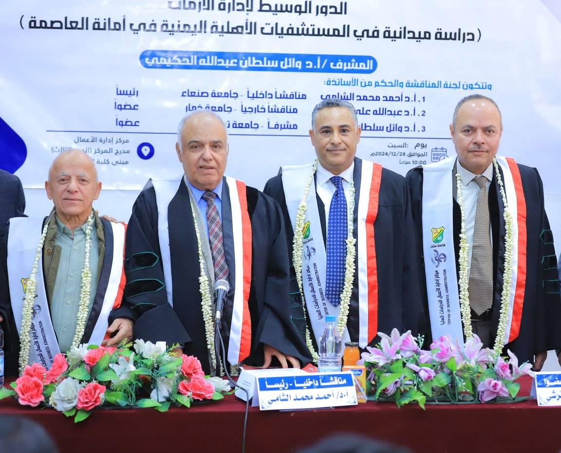 Mr. Ibrahim Abdullah Shaif Al-Somat has successfully obtained his PhD degree from the Center of Business Administration Studies, Sana’a University, majoring in Business Administration. His dissertation, titled “Strategic Leadership and Its Impact on Organizational Performance: The Mediating Role of Crisis Management (A Field Study in Yemeni Private Hospitals in the Capital Secretariat) was presented on 27\6\ 1446 Hijri corresponding to 28/12/2024
