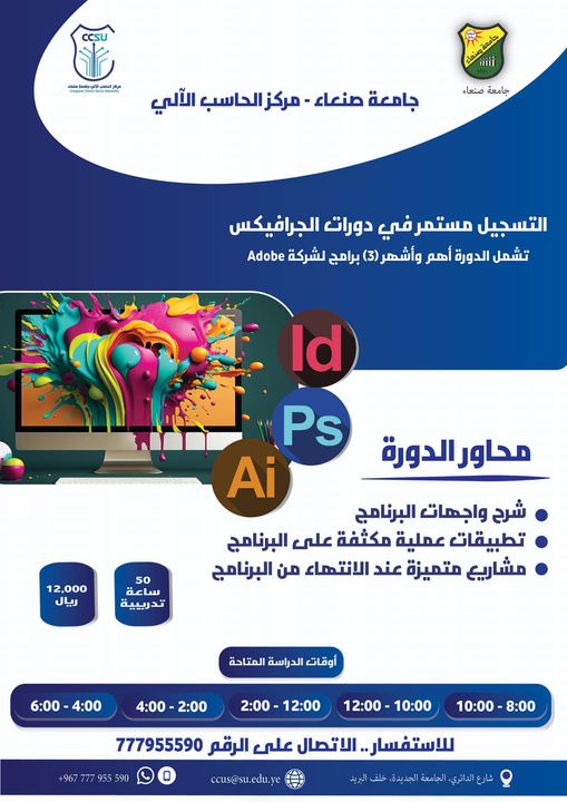 للتسجيل الحضور الى مركز الحاسب الالى جامعة صنعاء جوار بريد الجامعة او عبر وسائل التواصل الاجتماعي لمزيدا من المعلومات التواصل على الرقم التالي: